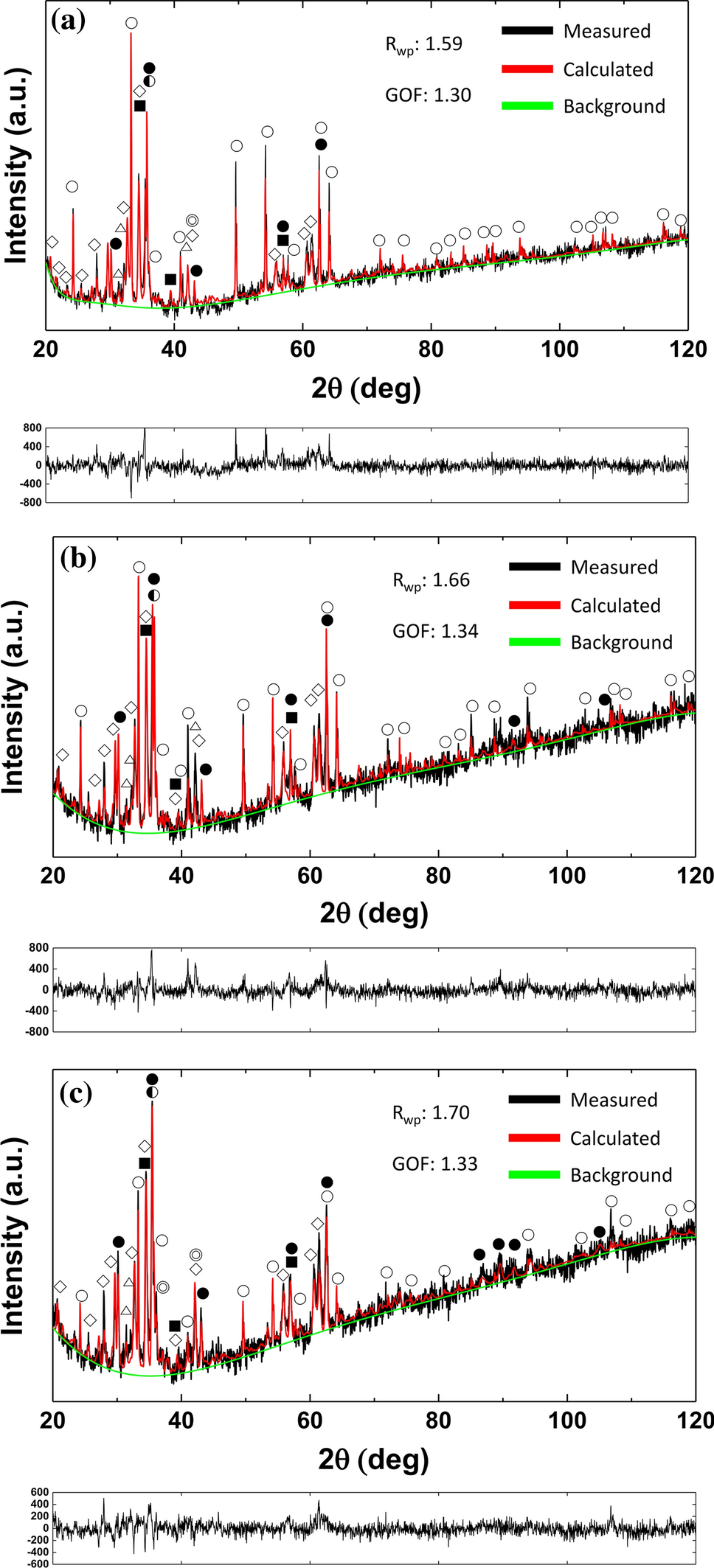 XRD patterns and Rietveld analysis results of the sinter samples: (a) sample 1, (b) sample 2, and (c) sample 3.