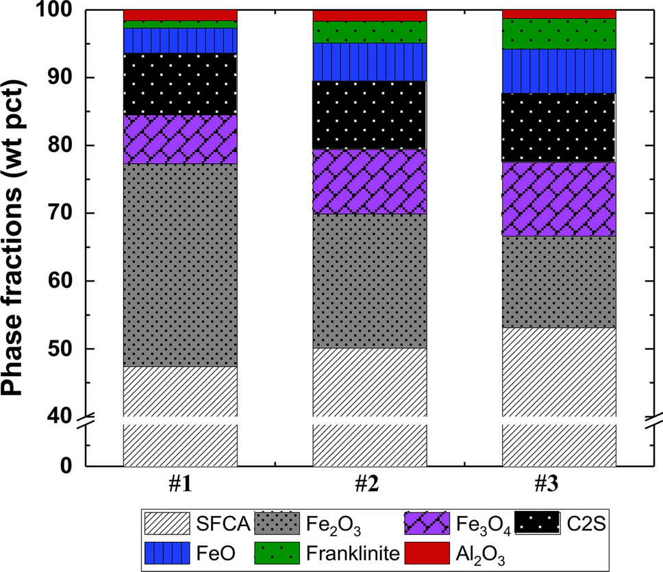 To investigate the effect of Al2O3, the Al2O3 content in the iron ore sinter was controlled from 1 to 3 wt pct, while the basicity was fixed at 2 and the ZnO content was 1 wt pct. For this purpose, samples 1, 6, and 7 are compared. Figure 9 shows the identification results of the XRD patterns of samples 6 and 7, and the Rietveld analysis results are graphically shown in Figure 10. As the Al2O3 content increased from 1 to 3 wt pct, the amount of SFCA increased from 47.4 to 83.2 wt pct. On the other hand, the amount of Fe2O3, Fe3O4, and franklinite decreased. Al2O3 is known as a stabilizing element for the formation of calcium ferrite,[44‐46] and Webster et al.[19] reported that with increasing Al2O3 content, the formation temperature of SFCA in the cooling process increased. Accordingly, increased Al2O3 content would accelerate the formation of SFCA in the sinter.