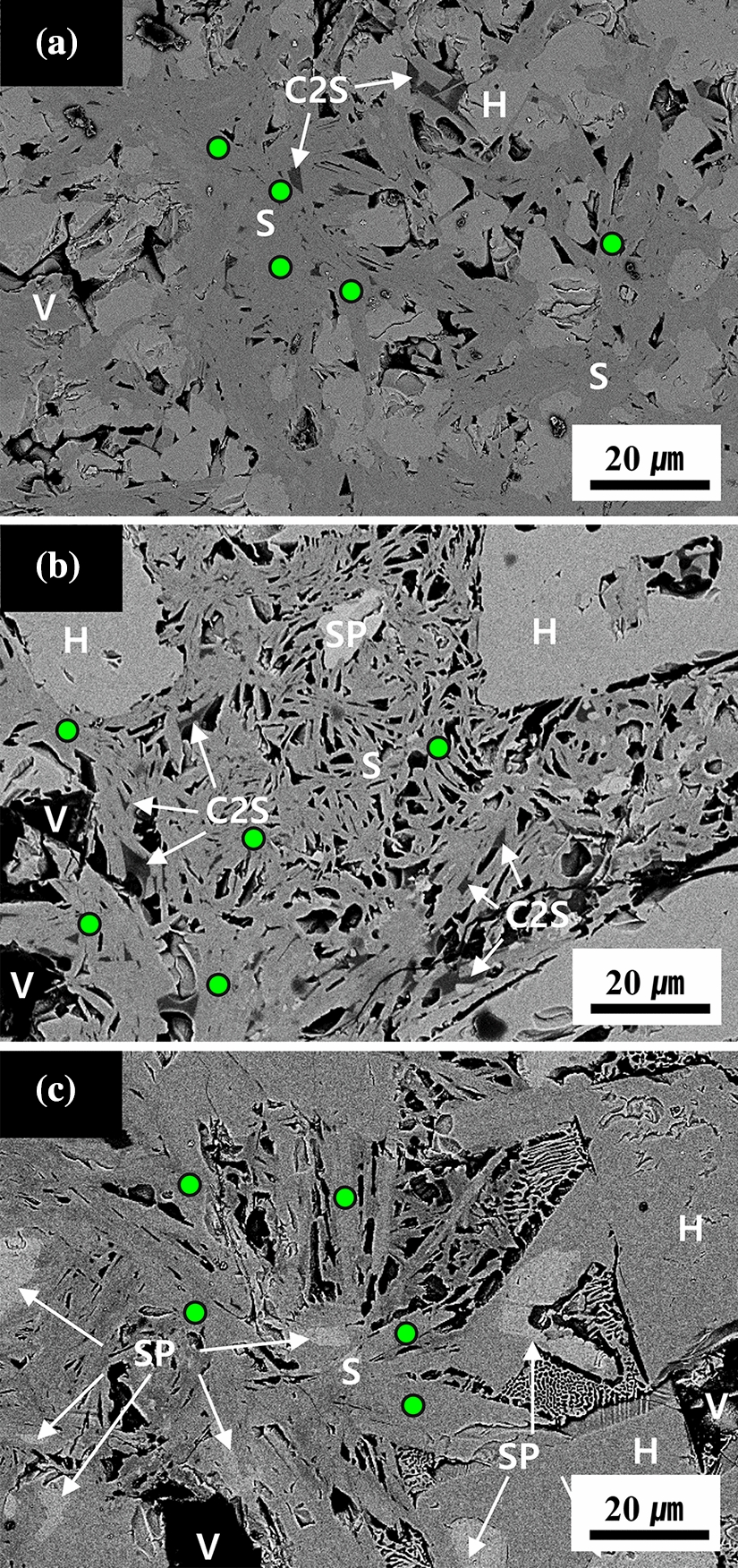 BSE micrograph of the samples: (a) sample 1 (1 wt pct ZnO), (b) sample 2 (2 wt pct ZnO), and (c) sample 3 (3 wt pct ZnO). S: SFCA, H: hematite, SP: spinel group including magnetite and franklinite, C2S: dicalcium silicate, V: void, and EDX analysis points are indicated as green dots (Color figure online)