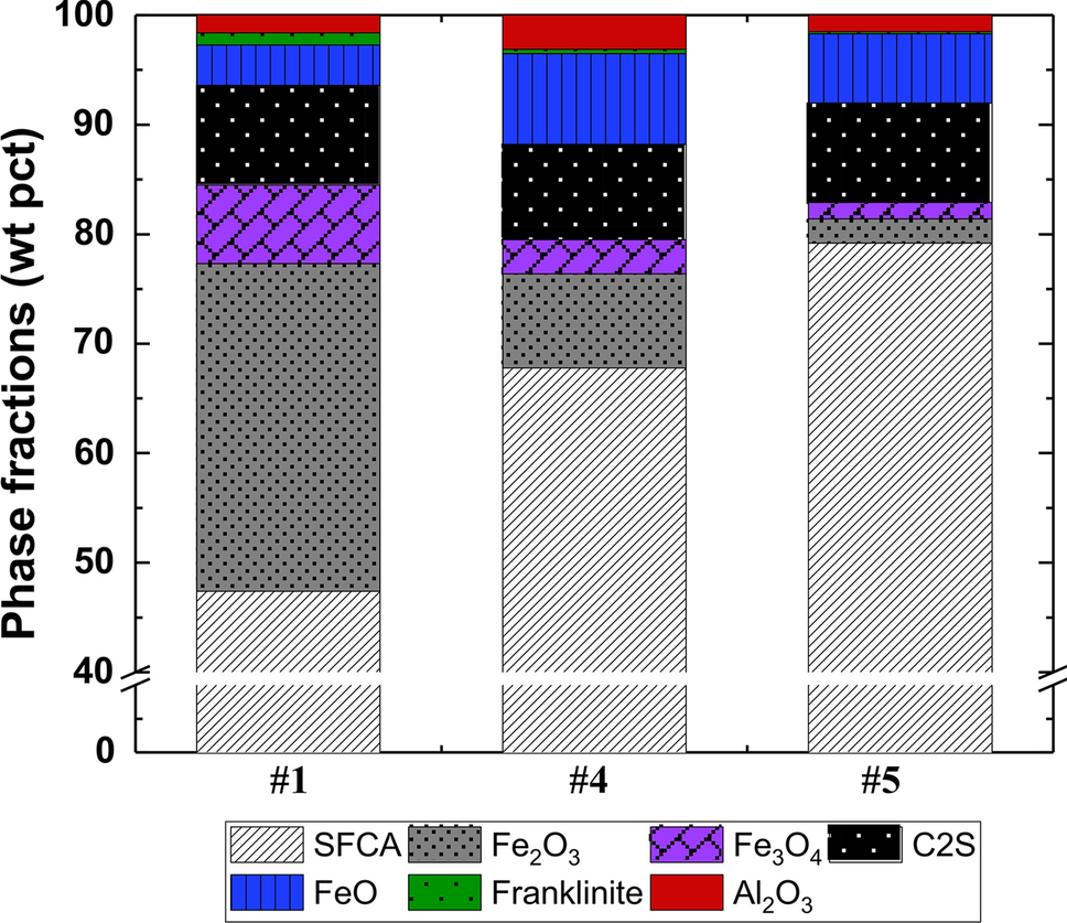 To investigate the effect of basicity, the basicity was controlled from 2 to 4, while the ZnO and Al2O3 contents were fixed at 1 wt pct, respectively. For this purpose, samples 1, 4, and 5 are compared. Figure 6 shows the identification results of the XRD patterns of samples 4 and 5. Fe2O3, Fe3O4, FeO, SFCA, C2S, franklinite, and Al2O3 were identified for these samples. The Rietveld analysis results are summarized in Table III and graphically shown in Figure 7. The amount of SFCA increased with increasing basicity, whereas those of Fe2O3, Fe3O4, and franklinite decreased.