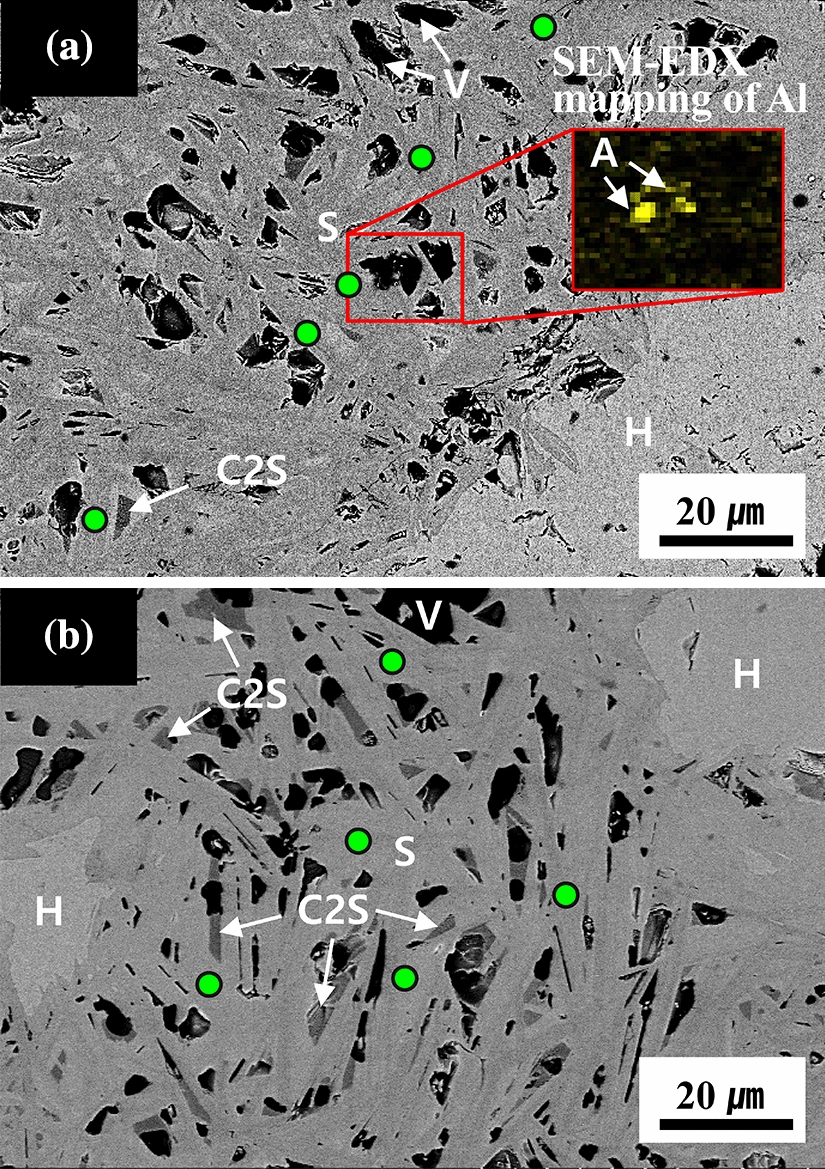 BSE micrograph of the samples: (a) sample 4 (basicity 3) and (b) sample 5 (basicity 4). S: SFCA, C2S: dicalcium silicate, A: Al2O3, V: void, and EDX analysis points are indicated as green dots (Color figure online)