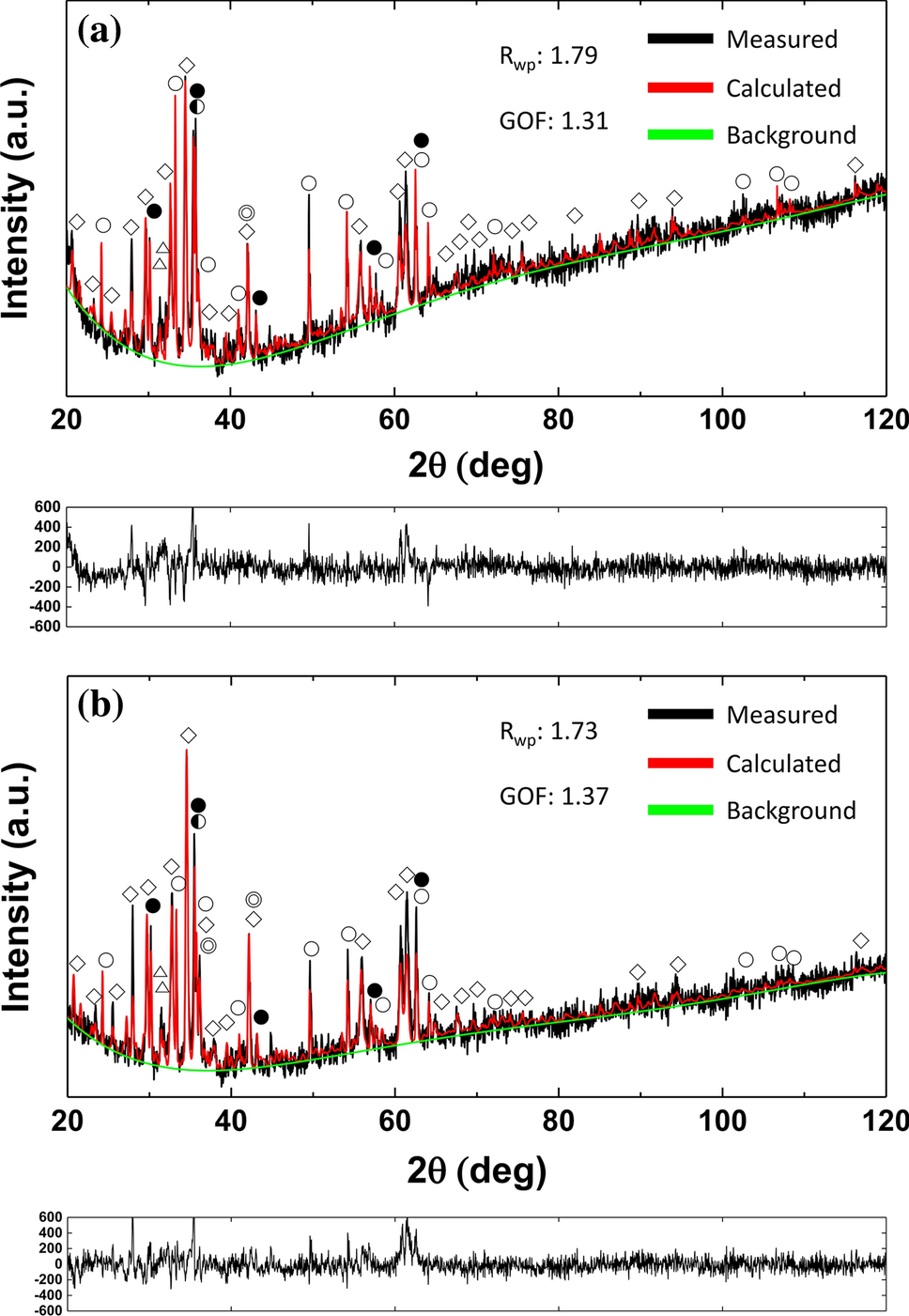 XRD patterns and Rietveld analysis results of sinter samples: (a) sample 6 and (b) sample 7.