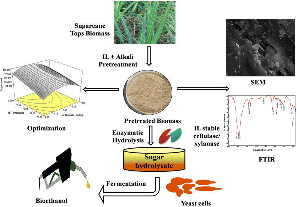 Efficient bioconversion of sugarcane tops biomass into biofuel-ethanol using an optimized alkali-ionic liquid pretreatment approach