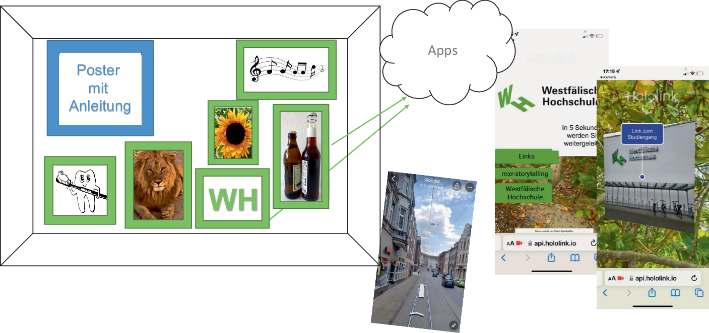 Richtet man die Kamera des Mobiltelefons beispielsweise auf das Logo, wird über die App HoloLink ein 360° Raum aktiviert, in dem man sich räumlich bewegt und Video und Texte zu verschiedenen Studiengängen abrufen kann. Eine ähnliche Art der Immersion ist mit ArtiVive möglich; hier wird über das Erkennen einer Flasche als reales Objekt eine Bewegtbildsequenz mit Namen und Wegbeschreibung der Retrokneipe aktiviert und am Mobiltelefon im Routenplaner angezeigt. Beides ist intuitiv zu realisieren und erlernen. Die Noten könnten beispielhaft für künstlerische Inhalte wie das nächste Sonntagskonzert oder den örtlichen Gesangsverein stehen, der Löwe für eine lebendige Geschichte oder einen Link zu Sommerangeboten des Zoos, die Blume könnte auf lokale Floristen oder Kinderaktionen in den nahen urbanen Gemeinschaftsgärten hinweisen.