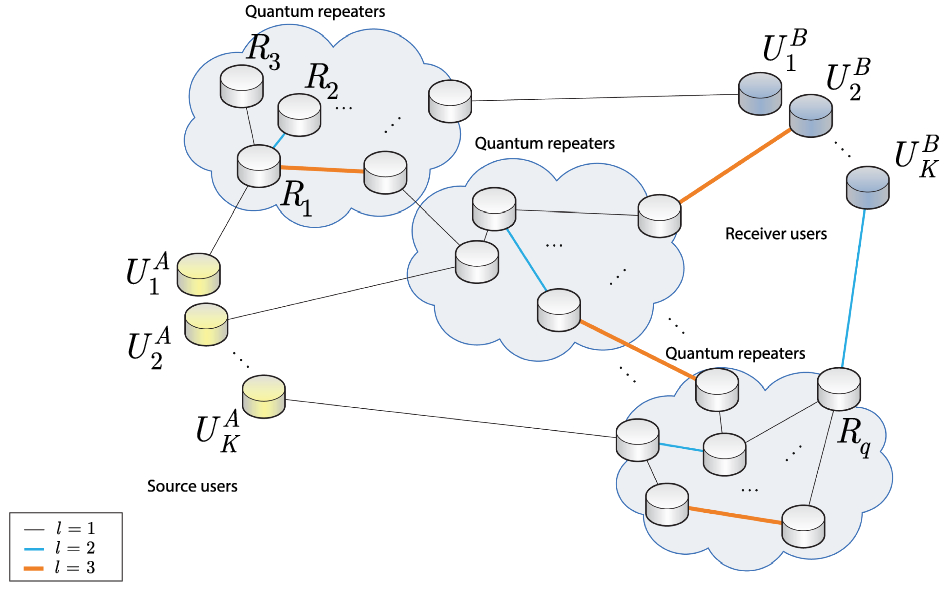 An entangled overlay quantum network in a quantum Internet scenario. The quantum network consists of K source users (depicted by yellow nodes), \(U_{i}^{A}\), \(i=1,\ldots ,K\), K receiver users (depicted by blue nodes), \(U_{i}^{B}\)\(i=1,\ldots ,K\), and a set of intermediate quantum repeaters (depicted by gray nodes in the clouds) \({{R}_{i}}\), \(i=1,\ldots ,q\), between the senders and receivers. The quantum nodes are connected via l-level entangled connections, where \(l=1\) refers to a direct connection (black line), while \(l>1\) are multilevel connections. For \(l=2\) (blue thick line), the hop distance between the connected nodes is \({{d}_{l}}=2\), while for \(l=3\) (orange thicker line), the hop distance between the connected nodes is \({{d}_{l}}=4\) (Color figure online)