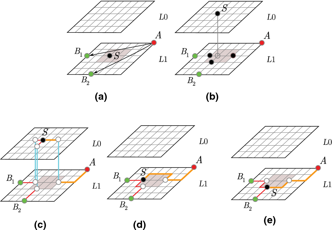 Assignments of an entanglement switcher port in the multilayer structure. a The source node A would like to establish an entangled connection with target ports \(B_{1} \) or \(B_{2} \); however, an optimal assignment of switcher port S would require an entangled port from the set of inaccessible entangled ports of the switcher node (grey area). b Possible suboptimal assignments (black dots) of the switcher S in current layer L1 and lower-quality layer L0. c The entanglement switcher port S is assigned into layer L0 with path length \(c_{A\rightarrow B} =c_{A\rightarrow B_{1} } +c_{A\rightarrow B_{2} } =12+3\kappa \) and overlapping path length \(\zeta _{A\rightarrow S} =6+\kappa \) (depicted by thick orange line). Intermediate ports are depicted by empty dots. d The switcher port S is assigned into L1, with path length \(c_{A\rightarrow B} =c_{A\rightarrow B_{1} } +c_{A\rightarrow B_{2} } =15\) and overlapping path length \(\zeta _{A\rightarrow S} =9\). e The switcher port S is assigned into L1, with path length \(c_{A\rightarrow B} =c_{A\rightarrow B_{1} } +c_{A\rightarrow B_{2} } =15\), and overlapping path length \(\zeta _{A\rightarrow S} =7\) (Color figure online)