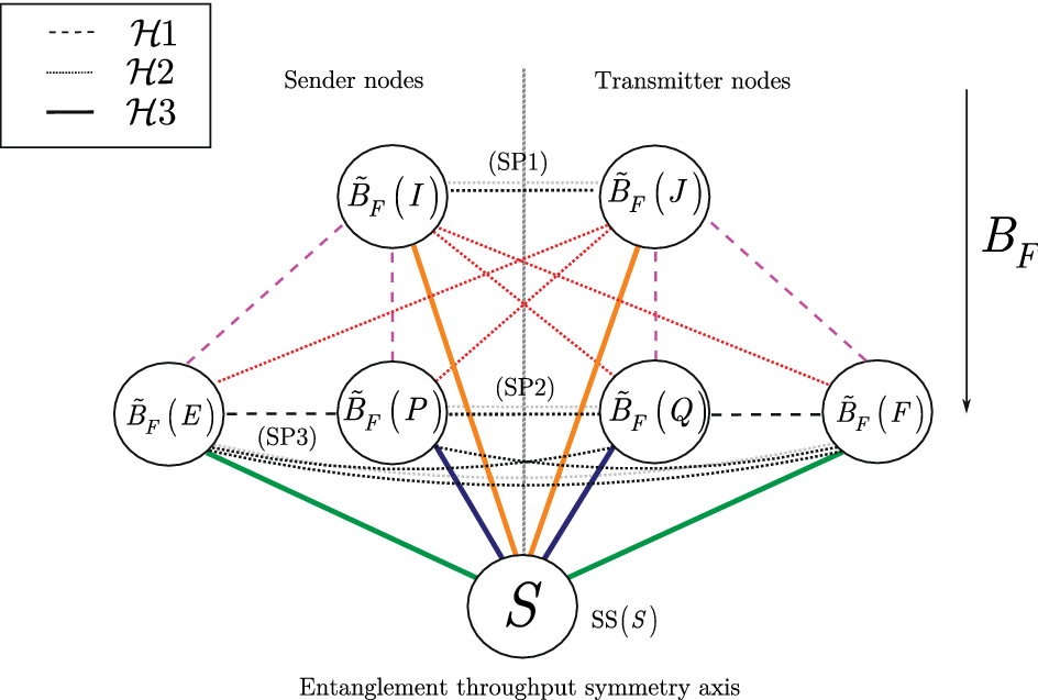 The entanglement throughput symmetry axis is extracted as follows. Let \(\left( I,J\right) \) be an entangled port pair, where I is a source entangled port and J is a target entangled port with same maximal entangled throughputs \({{{\tilde{B}}}_{F}}\left( I \right) =\max \left( {{B}_{F}}\left( I \right) \right) \) and \({{{\tilde{B}}}_{F}}\left( J \right) =\max \left( \left| {{B}_{F}}\left( J \right) \right| \right) \). These entangled ports formulate a symmetry pair (SP) [107] as