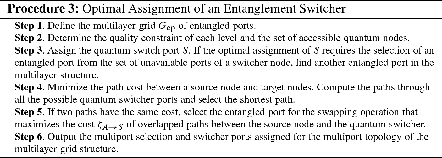 The method for assigning a quantum switcher port in a \(G_\mathrm{ep} \) multilayer grid structure is summarized in Procedure 3.
