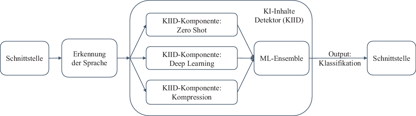 Die Abb. 1 stellt die Architektur des KI-Inhalte Detektor (KIID) dar. Dieser Detektor besteht aus fünf zentralen Komponenten. Die erste Komponente ist eine Sprachenerkennung, die prüft, ob es sich tatsächlich um einen deutschsprachigen Text handelt. Der eigentliche Detektor besteht aus vier Komponenten und führt drei Verfahren zur Erkennung von KI-generierten Texten zusammen.