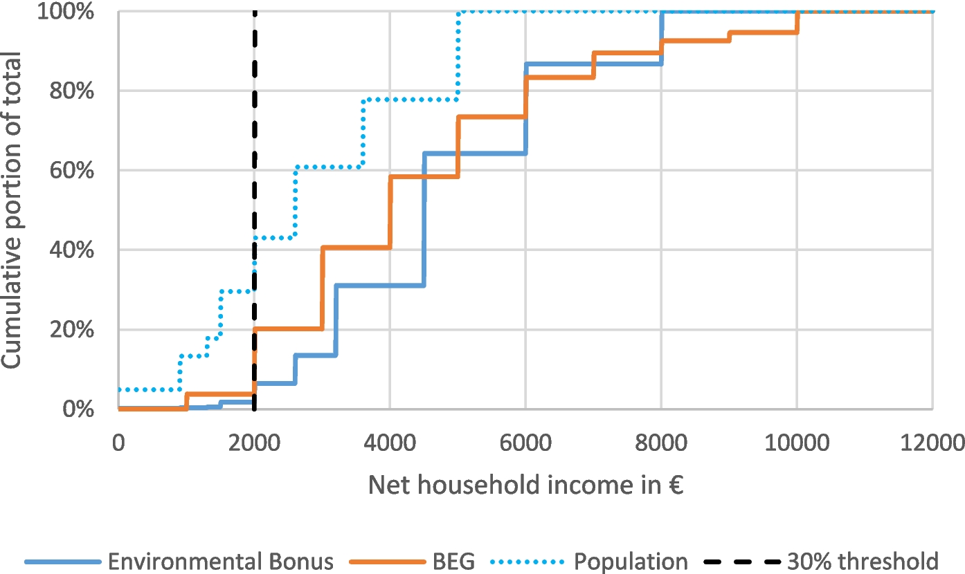 The selection of the 30% threshold is due to three reasons, generally provided data for policy measures, typical funding programmes household income distribution curves, and the poverty line. Evaluation data on household income of recipients include a variety of different income bracket systems, with only one threshold used in nearly every evaluation: 2000€ net monthly household income. This threshold corresponded to the lower 29.6% of the German population in terms of income in 2018 and seems to still represent roughly 30% in 2024 (bpb, 2020; Destatis, 2025). Furthermore, around 30% in income rank seems to be the point from where on the representation of households in subsidy programmes significantly rises, as inter alia both analysed studies show. Finally, it is rather close to the German poverty line (60% of median household income), which laid at 1844€ in 2024 (Destatis, 2025). However, it is worth noting that this is merely the average poverty line, since it generally depends on the household composition (Ravaillon, 1998).