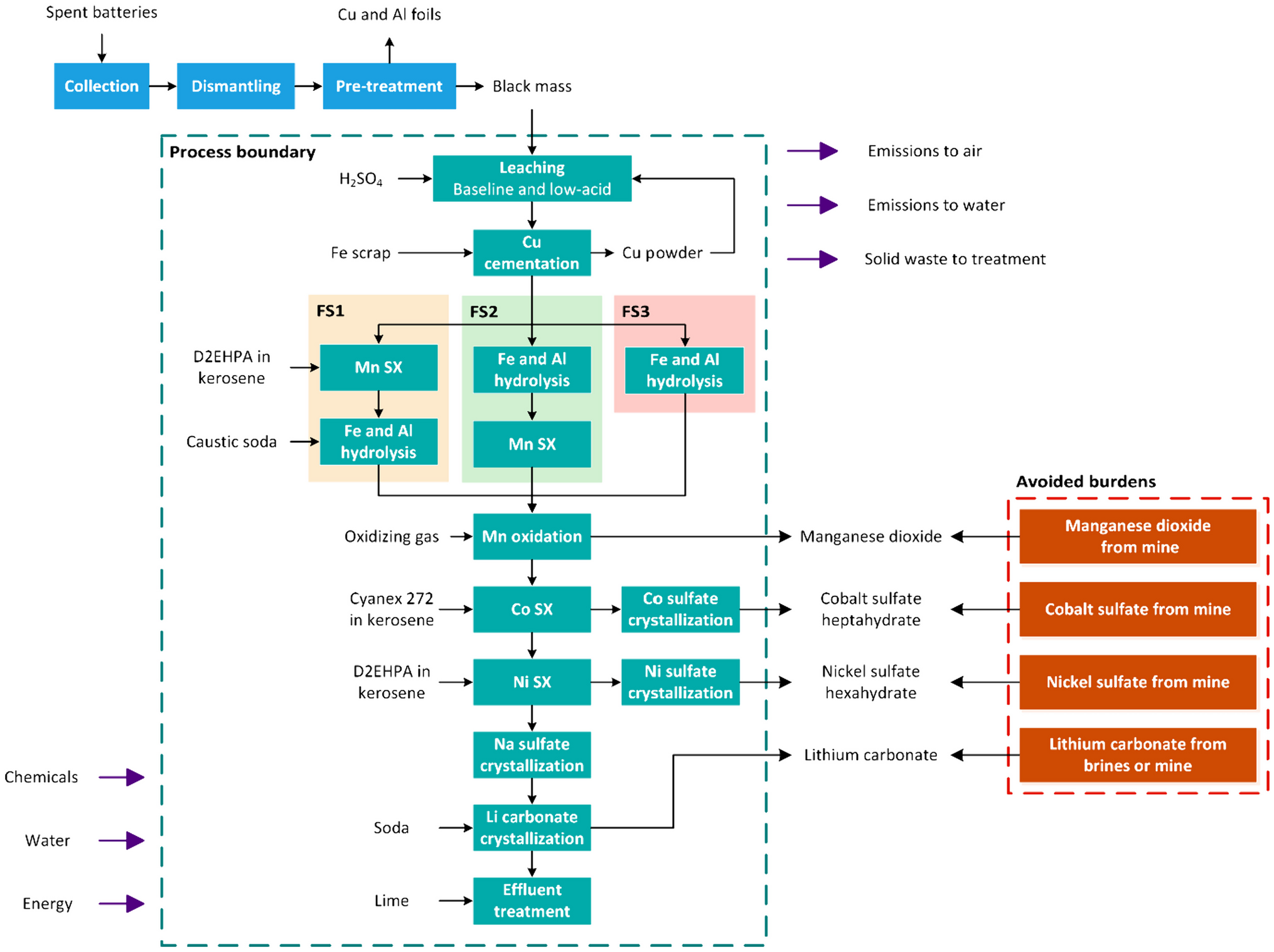 The flowsheet was drafted from the literature by combining both state-of-the-art and experimentally demonstrated unit processes by starting with the leaching system, where reductive leaching is performed using only the copper and iron impurities already present in the black mass. The process targeted copper, manganese, cobalt, nickel, and lithium recovery, and three scenarios for manganese recovery were investigated. The flowsheet was simulated using HSC Sim software, and the mass and energy balances were adapted into internally consistent life cycle inventories. The scope was “gate-to-gate” in Europe and CML methodology was used for impact assessment.