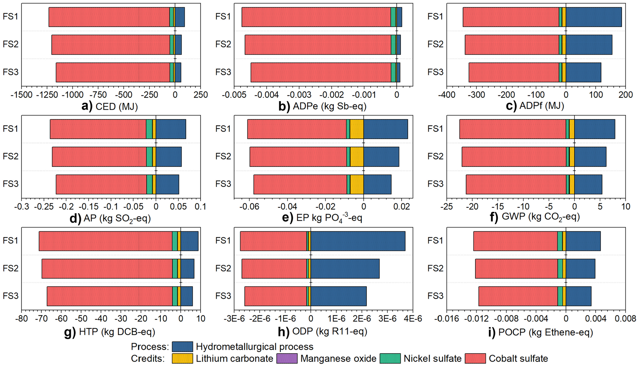 While the above example highlights that the comparison of recycling to virgin production may be misleading, it can nevertheless be useful in determining the optimal solution between valuable metal recovery and process conditions. FS1 had the highest recoveries for each of the metals, but this was offset by the increased process intensity in all but ADPe. FS3, on the other hand, had the lowest impacts but also the lowest nickel and cobalt recovery and therefore the lowest net impacts (Fig. 3, i.e., after factoring in the recovery credits) in ADPf, EP, ODP, and POCP. FS2 provided a balance between the two scenarios, and it was the preferred option in terms of CED, AP, GWP, HTP, and the second after FS1 in ADPe.