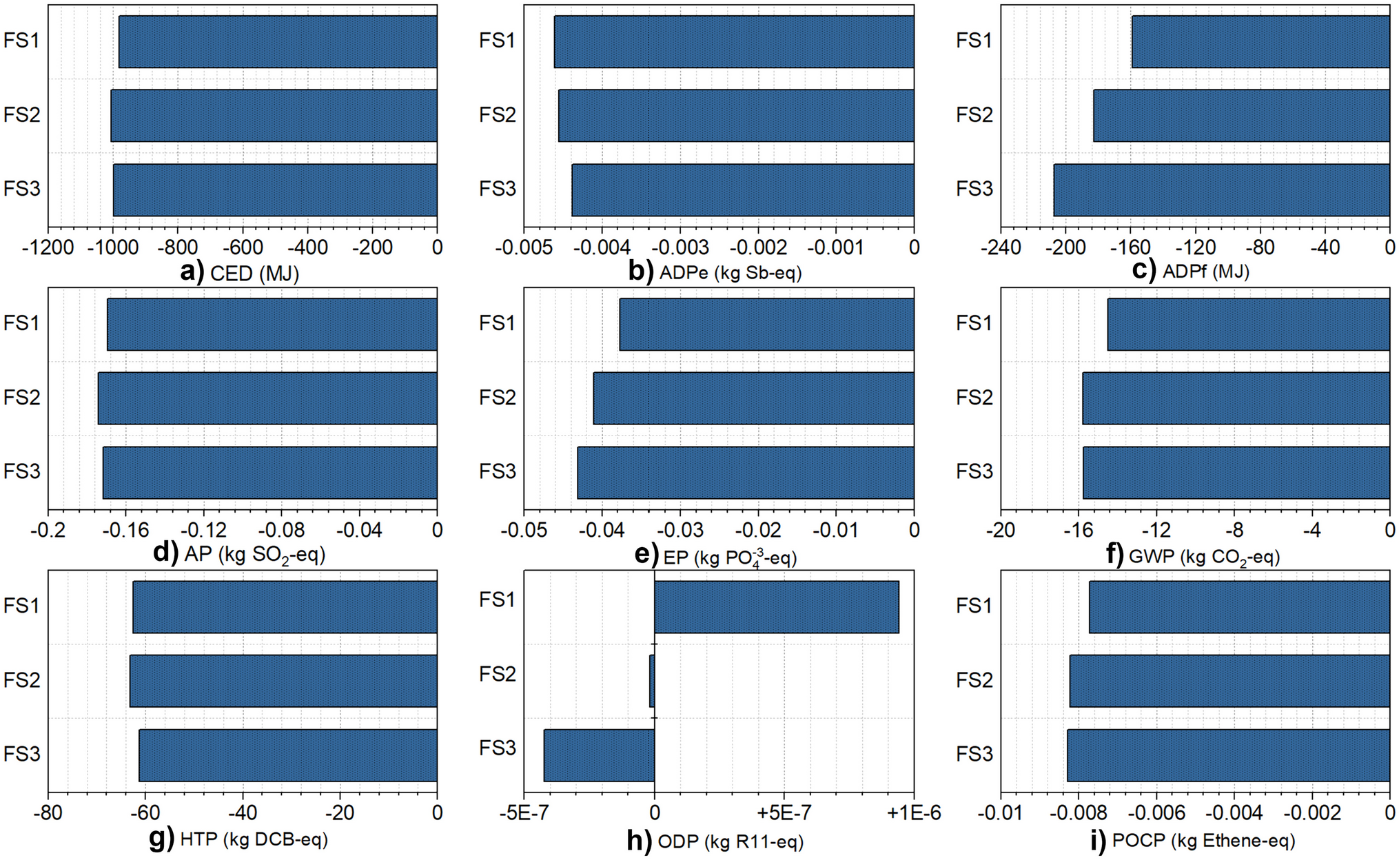 The process impacts and recovery credits are presented in Fig. 2. It was observed that FS1 had the highest process impacts in all categories and FS3 the lowest. The 100-year GWP for each of the scenarios was 7.96 kg CO2-eq for FS1, 6.22 kg CO2 eq for FS2, and 5.44 kg CO2-eq for FS3 per FU. The largest differences between the scenarios were in ozone depletion and the smallest in acidification, and the FS1 impacts were approximately 14–27% greater than for FS2, and 23–41% greater than for FS3. These differences do not appear inconsequential given their magnitude.