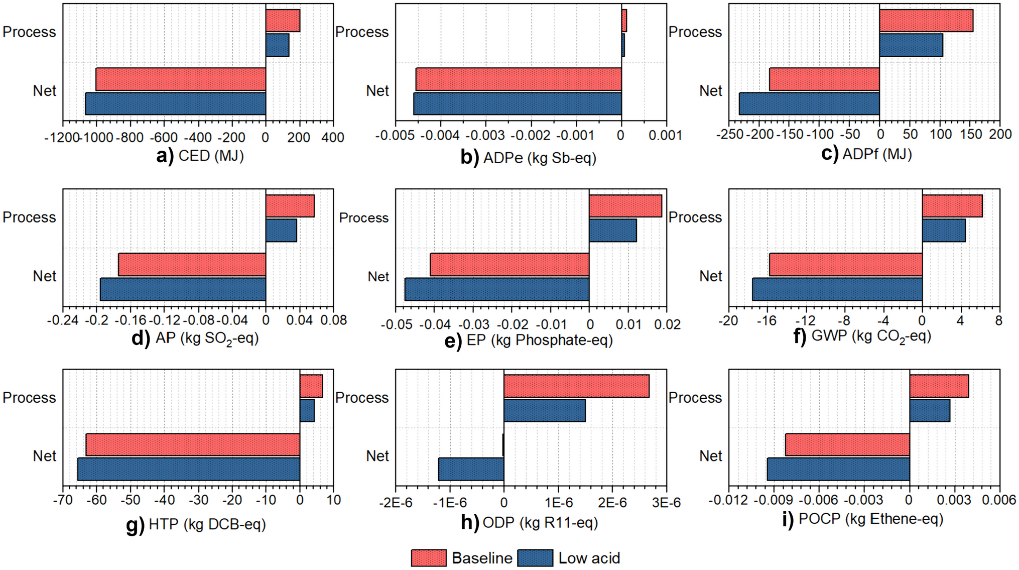 Comparison of FS2 impacts between low and baseline leach solution acidity, both process and net impacts per FU. a CED, MJ; b ADPe, kg Sb-eq; c ADPf, MJ; d AP, kg SO2-eq; e EP, kg phosphate-eq; f GWP, kg CO2-eq; g HTP, kg DCB-eq; h ODP, kg R11-eq; i POCP, kg ethene-eq