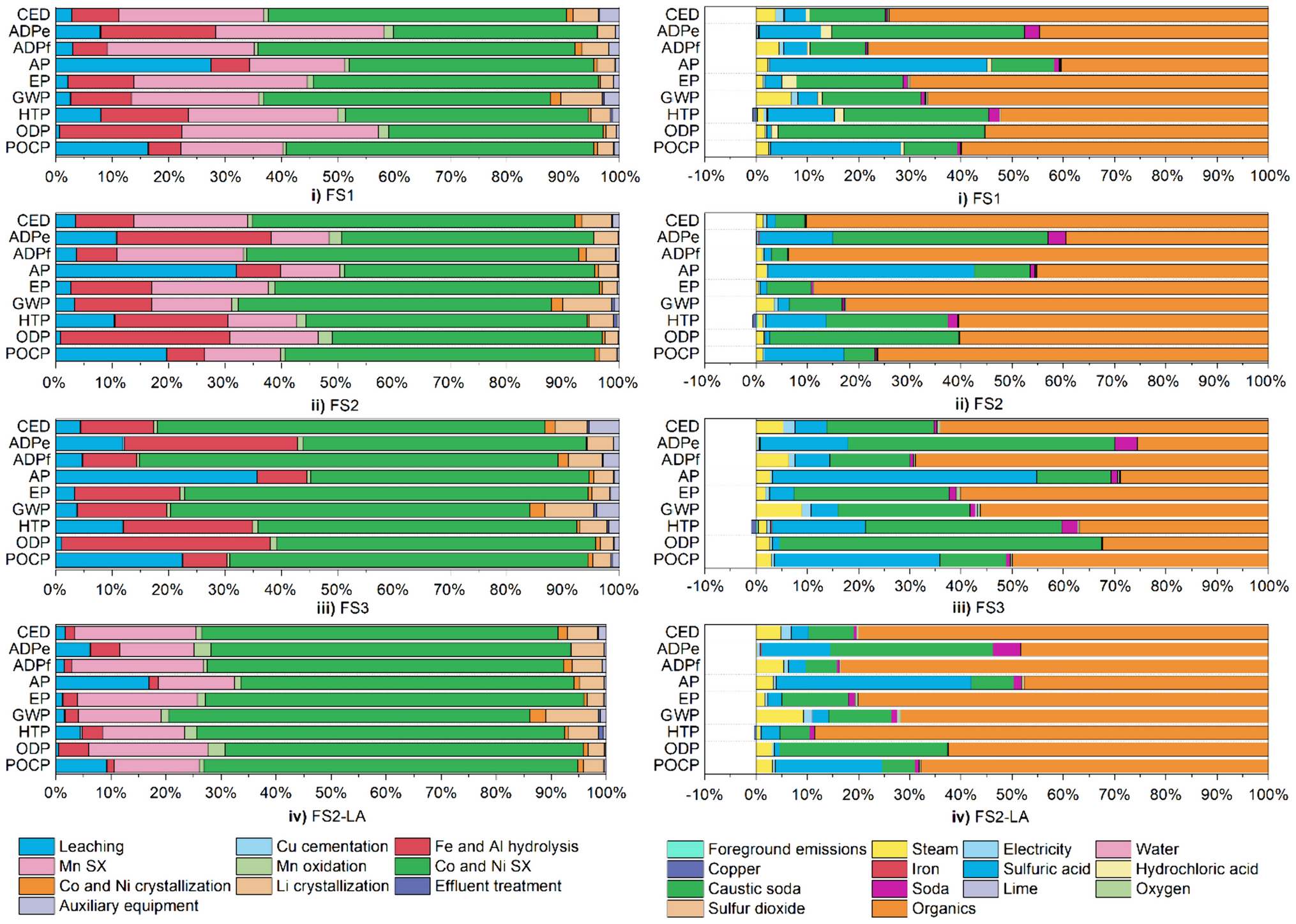 Although leaching in and of itself contributes substantially only to AP (~ 30% FS1-FS3, 16.9% FS2-LA) and POCP (~ 20% FS1-3, 9.2% FS2-LA) mainly due to sulfuric acid consumption, the effect of leaching is also felt downstream in the process as can be observed by comparing FS2 and FS2-LA. The consumption of caustic soda is effectively reduced in iron and aluminum removal by performing the leaching step in milder conditions. The reduction in caustic soda use is, based on the contributions, more significant than the lower consumption of sulfuric acid particularly for ODP, but also GWP, CED, ADPe, ADPf, EP, and HTP impacts.