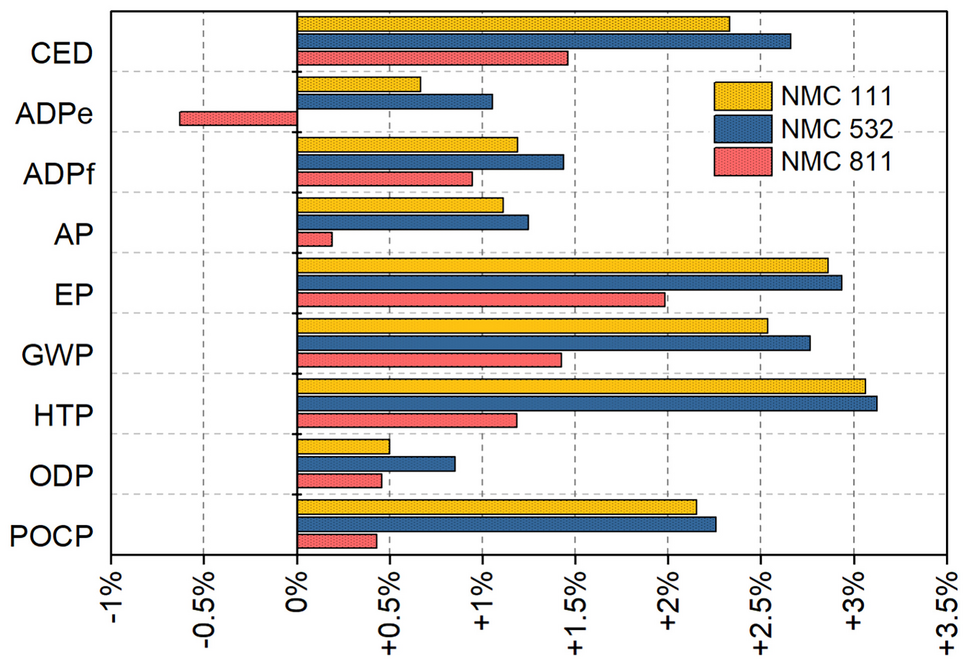 Even the largest differences observed in human toxicity were only + 3.1%, + 3.1%, and + 1.2% for NMC111, 532, and 811, respectively. In terms of GWP, the impacts increased by 2.5%, 2.8%, and 1.4% for each of the studied chemistries in the same order, and the average difference from the default FS2 was 1.8%, 2.0%, and 0.8%. The differences are, therefore, not substantial, and the effect of the cathode active material composition is limited to certain consumables when the impurities and inert carbon are kept constant. This is only true for black masses containing cobalt, nickel, and manganese, however, and a major shortcoming of the process is that it is not tailored to process LFP batteries efficiently. LFP cathodes could, at best, provide reducing power for the leaching step through iron, and dissolved lithium can be recovered, but the iron and phosphate would be lost.