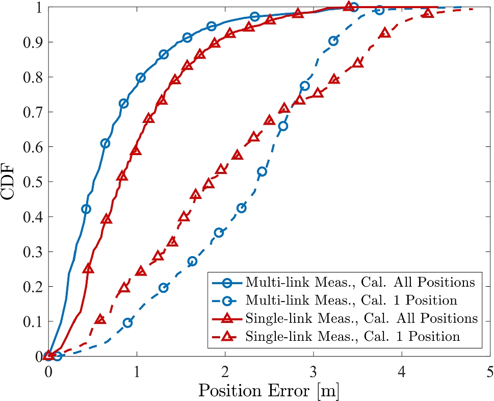 With respect to position estimation, we conducted a thorough analysis of the multi-link testbed’s performance. Then, we compared the results obtained with multi-link measurements with those obtained using the single-link measurements for simulating a multi-link scenario. This analysis aims to understand if using a smaller testbed with a single-link can be sufficient for having insights into positioning performance in a multi-link scenario. Figure 10 depicts the CDF of the positioning error using non-linear LS algorithm for both approaches and considering the two types of calibrations. Our findings indicate that the two approaches (single-link and multi-link) are comparable in terms of positioning performance. When all the positions are used in the calibration phase, the single-link approach slightly underestimates the performance, while with the calibration based on a single position, the two results are even more comparable.