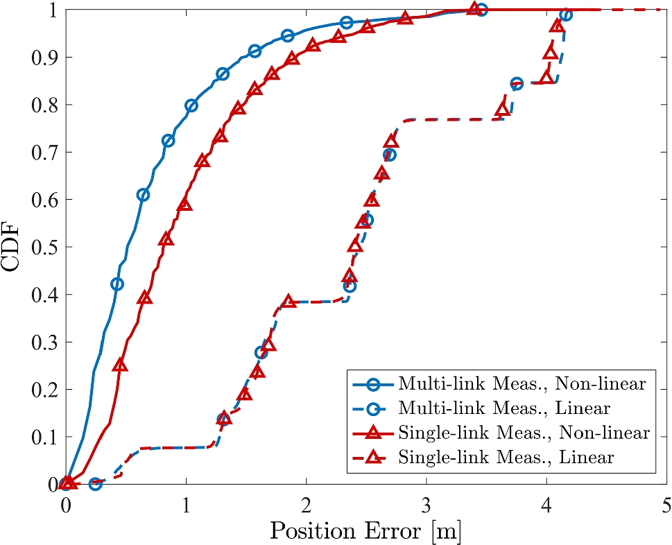 Finally, Fig. 11 compares the multi-link and single-link approaches when two different algorithms are used, i.e., the non-linear and linear least square. For the linear least-square case, the difference between the results obtained with the multi-link and single-link approaches is negligible.