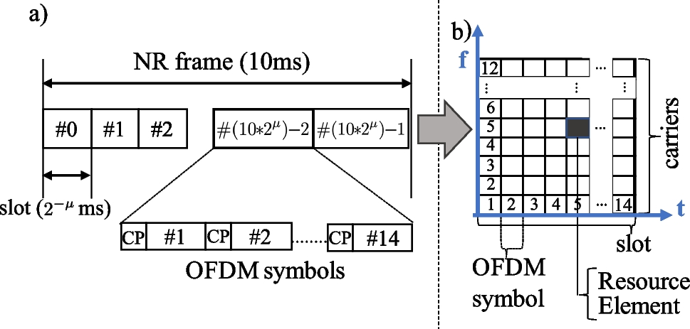 At the physical layer, UE transmissions are scheduled within continuous sequences called NR frames, each lasting 10 ms. The 5G NR improves frequency range support by supporting new frequency ranges (FR), including sub-6 GHz range FR1 and mmWave range FR2 with frequencies above 24 GHz. In addition, 5G NR improves the structure of the physical layer, compared to long-term evolution (LTE) by doubling the maximum FFT size to 4096 and by introducing flexible numerology, denoted by \(\mu \in \{0, \ldots , 6\}\), which doubles the slot orthogonal frequency-division multiplexing (OFDM) symbols and incorporates a modulation scheme that supports configurable subcarrier spacing (SCS), denoted as \(\Delta _{f} = 2^{\mu } \cdot 15\) kHz. The numerology \(\mu = 0\) corresponds to the same SCS 15 kHz as LTE.