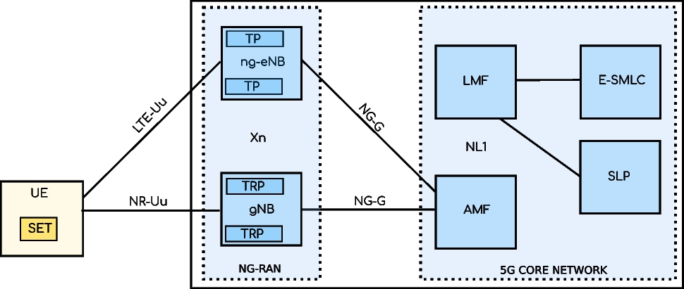 5G Core network (5GCN) leverages the decomposition of the functions executed by the network nodes of the previous generations leading to a 5G architecture completely defined in terms of network functions (NFs) that are exposed as services. 5GCN is a service-based core with web-oriented service-based interfaces. In the remainder of the paper, we will focus on 5G positioning architecture, leveraging the Access and Mobility Management Function (AMF), Location Management Function (LMF), and reference signals, i.e., the PRS and sounding reference signal (SRS).