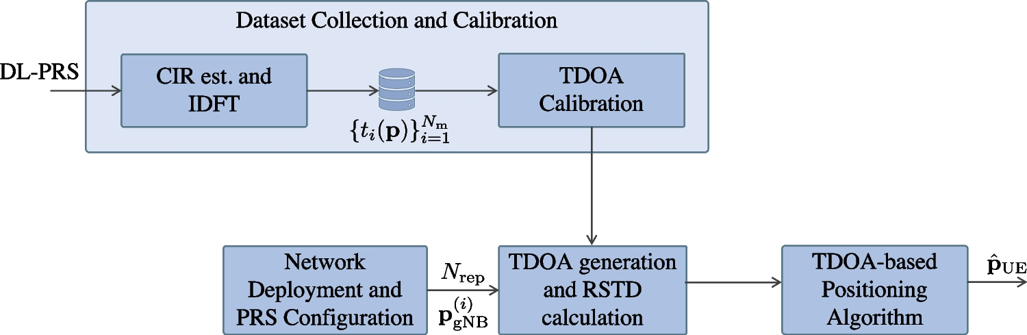 OAI-based UE implements a PRS-based ToA estimation 3GPP standard compliant. The procedure starts generating and modulating pilots, then calculating the RE offset of the PRS. Subsequent steps involve SNR estimation and PRS channel estimates conversion into FFT format. UE then computes the channel impulse response (CIR) in the time domain using IDFT oversampling up to 16×. Finally, ToA is estimated by locating the peak of the CIR as the maximum absolute value. For simultaneous reception of multiple synchronized PRS, each gNB utilizes a distinct PRS Resource Offset and NPRS ID. The PRS resource offset is crucial as it enables the differentiation of PRS transmissions from various gNBs by adding a slot offset of each PRS resource, while the NPRS ID plays a vital role in the initialization of a pseudo-random binary sequence that generates the PRS symbols, as defined in the 3GPP standard [19]. This results in accurate and efficient ToA estimation for multiple signals, allowing the UE to receive and process each signal individually yet concurrently.