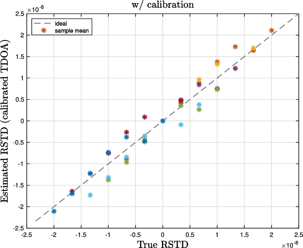 Figure 4 presents the estimated RSTD as a function of the true RSTD, varying the reference node and dataset. As demonstrated, the estimated RSTD closely aligns with the ideal bisector, which represents the theoretical scenario where the estimated TDOA exactly matches the true TDOA. This showcases the promising level of precision in the TDOA estimates, reflecting the overall good performance and calibration effectiveness of the system. It suggests that the implemented algorithms and calibration techniques provide accurate TDOA measurements, despite potential variations in reference node and dataset.