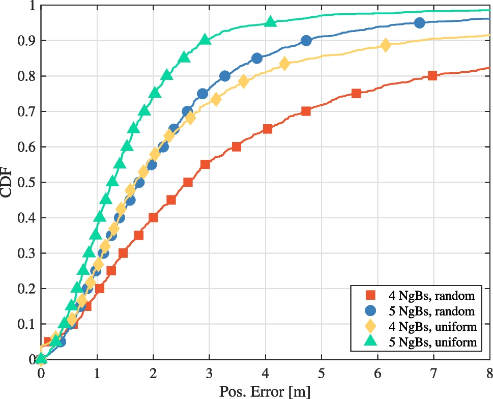 CDF of the positioning error varying the number of NgNBs and using a uniform or random angular distance between them