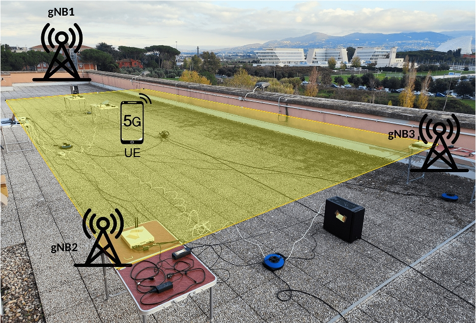 The experimental multi-link testbed is an evolution of the single-link testbed. As illustrated in Fig. 6, it is constituted by two custom workstations, a powerful portable workstation, four USRP X310 with UBX160 daughter cards used as radio transceivers emulating the operator’s network with three gNBs, and the user terminal. With the aim of validating the proposed approach, the network software platform and 5G NR channel are the same as the single-link testbed. Thus, the major differences are the use of a gNBs synchronizer and the experimental area.