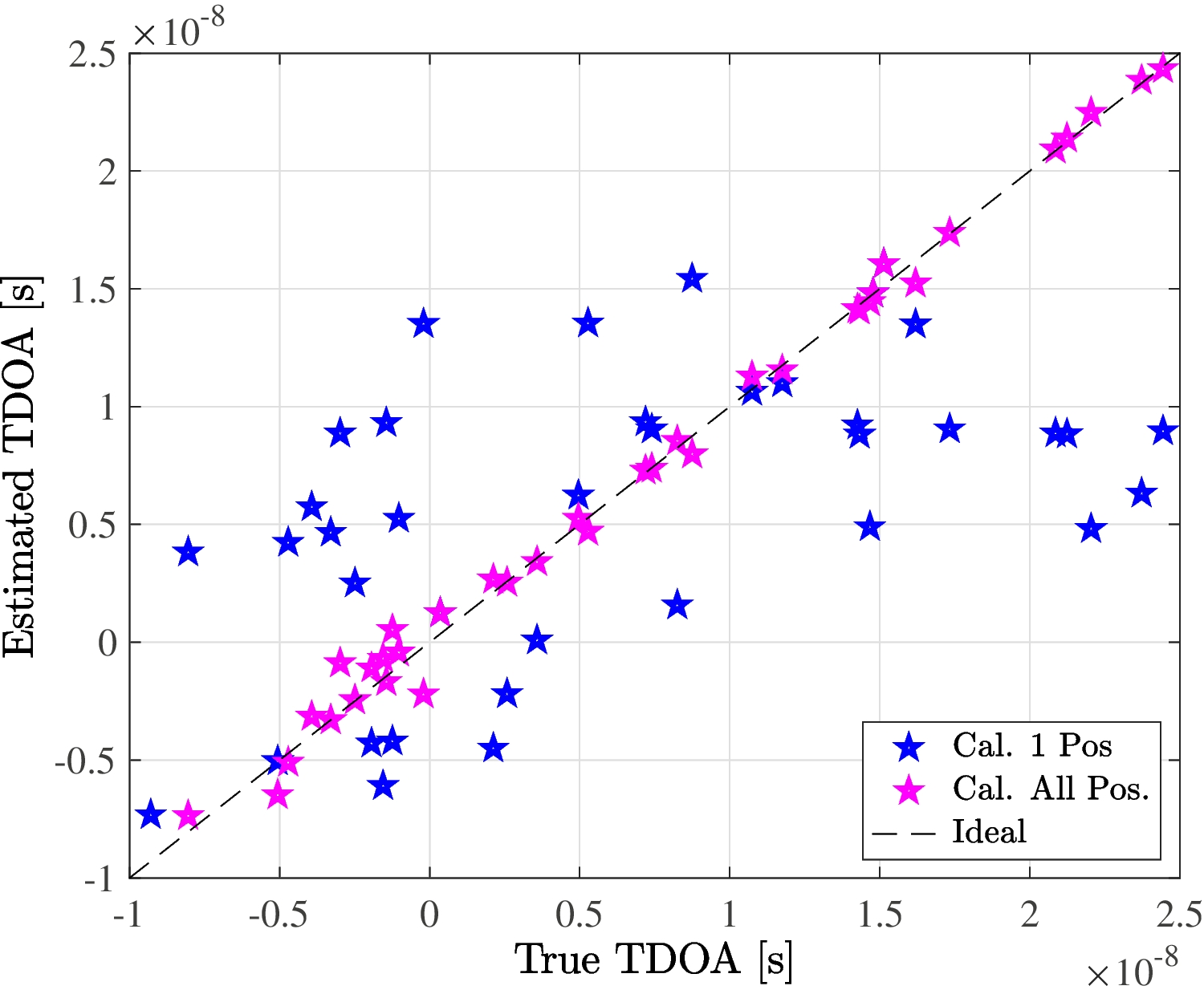 True vs. estimated TDOA for both calibration methods