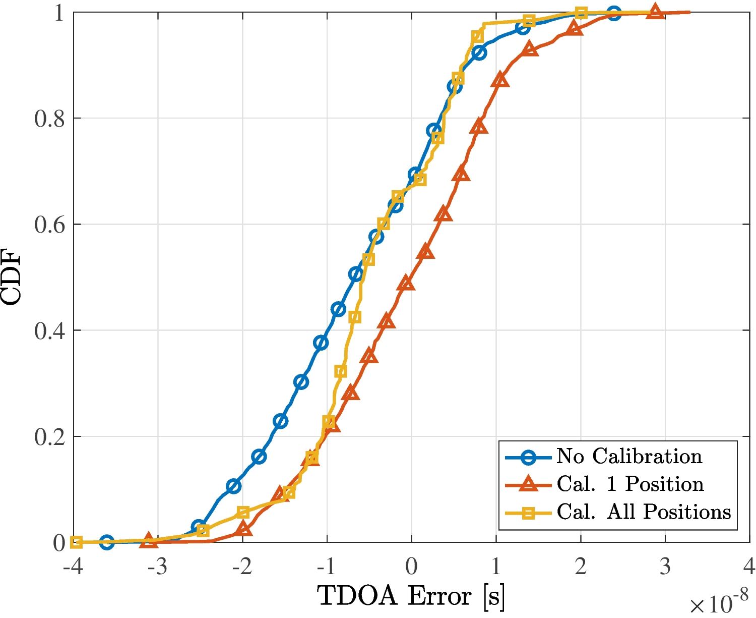 Figure 9 presents the empirical CDF of the TDOA error, comparing the results obtained with the two types of calibration with the non-calibrated case. Results show that the calibration changes the mean value of the TDOA error in both cases, i.e., leads to a zero-mean error. In addition, the use of measurements from all the positions also reduces the empirical variance.