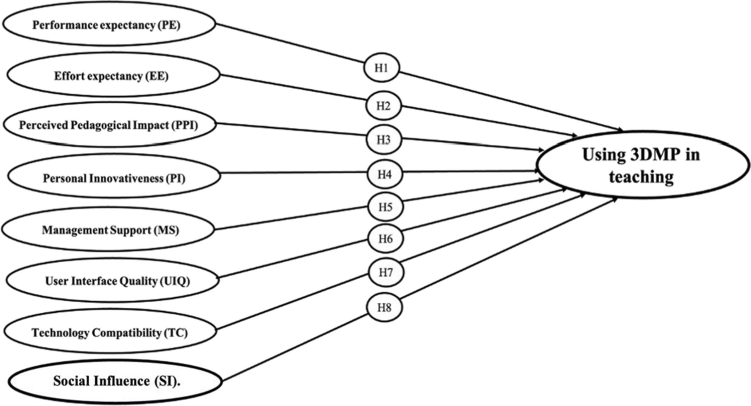 Performance expectancy (PE) is the extent to which an individual believes that the use of technology will improve performance (Venkatesh et al., 2003). In our study, PE is defined as teachers’ belief that the use of 3DMP will improve their teaching performance by facilitating instruction, increasing teaching productivity, and improving teaching effectiveness. According to Holzmann et al. (2020), PE is a significant predictor of teachers’ behavioural intention to use 3DMP in the classroom. Therefore, the following hypothesis is proposed:
