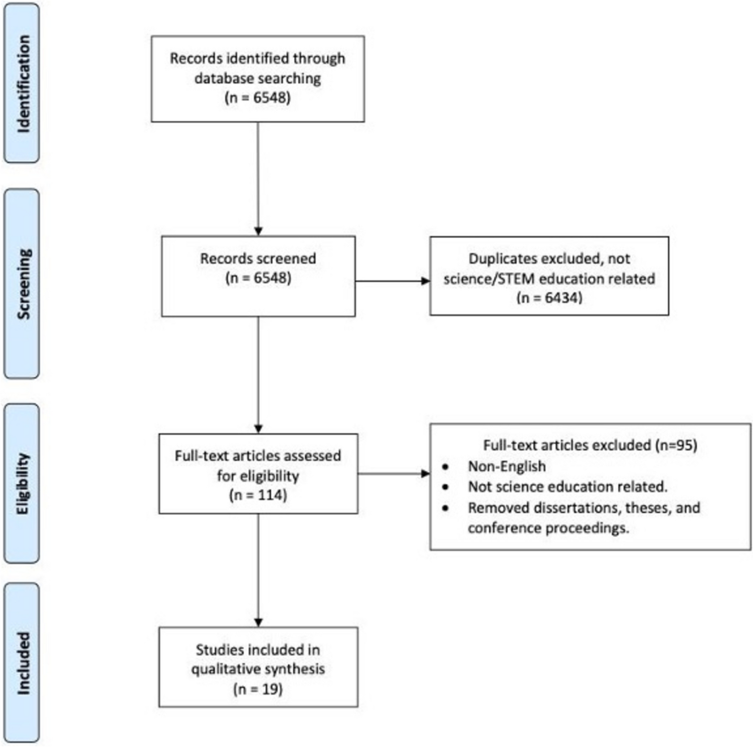 The search was conducted from Fall 2023 to Spring 2024. It yielded a total of 6548 articles across the selected databases, with 190 articles from ERIC, 5804 articles from Google Scholar, and 554 articles from the university library databases. Each article was subjected to a title and abstract scan. After removing duplicates and excluding articles not focused on “Science Education” or “STEM Education,” we were left with n = 114 remaining manuscripts. This process resulted in 114 articles being eligible for full-text review, which ultimately led to the identification of 19 eligible studies that were exclusively focused on science education. Any conflicts encountered during the review process were discussed and resolved by the authors in subsequent meetings.