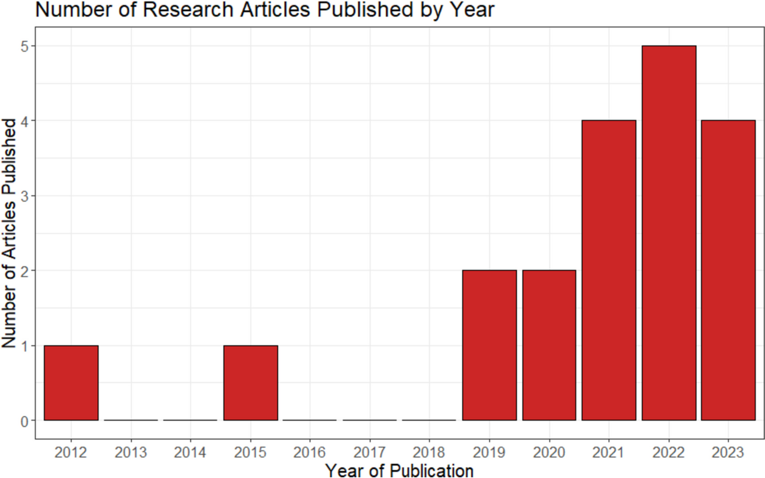 See Tables 2, 3, and 4 (end of paper) for a list of selected studies and extracted variables. Our final collection of articles that met the inclusion criteria consisted of 19 published, peer-reviewed journal articles published between 2012 and 2023 (Fig. 2). Since 2018, reporting of ENA as a research methodology has increased from 2 total publications between 2012 and 2018 to 17 total publications between 2019 and 2023. The maximum number of studies was in 2022 with five studies that year. This was followed by four studies in the years 2021 and 2023, 2 studies each in 2019 and 2020, and 1 in 2012 and 2015.