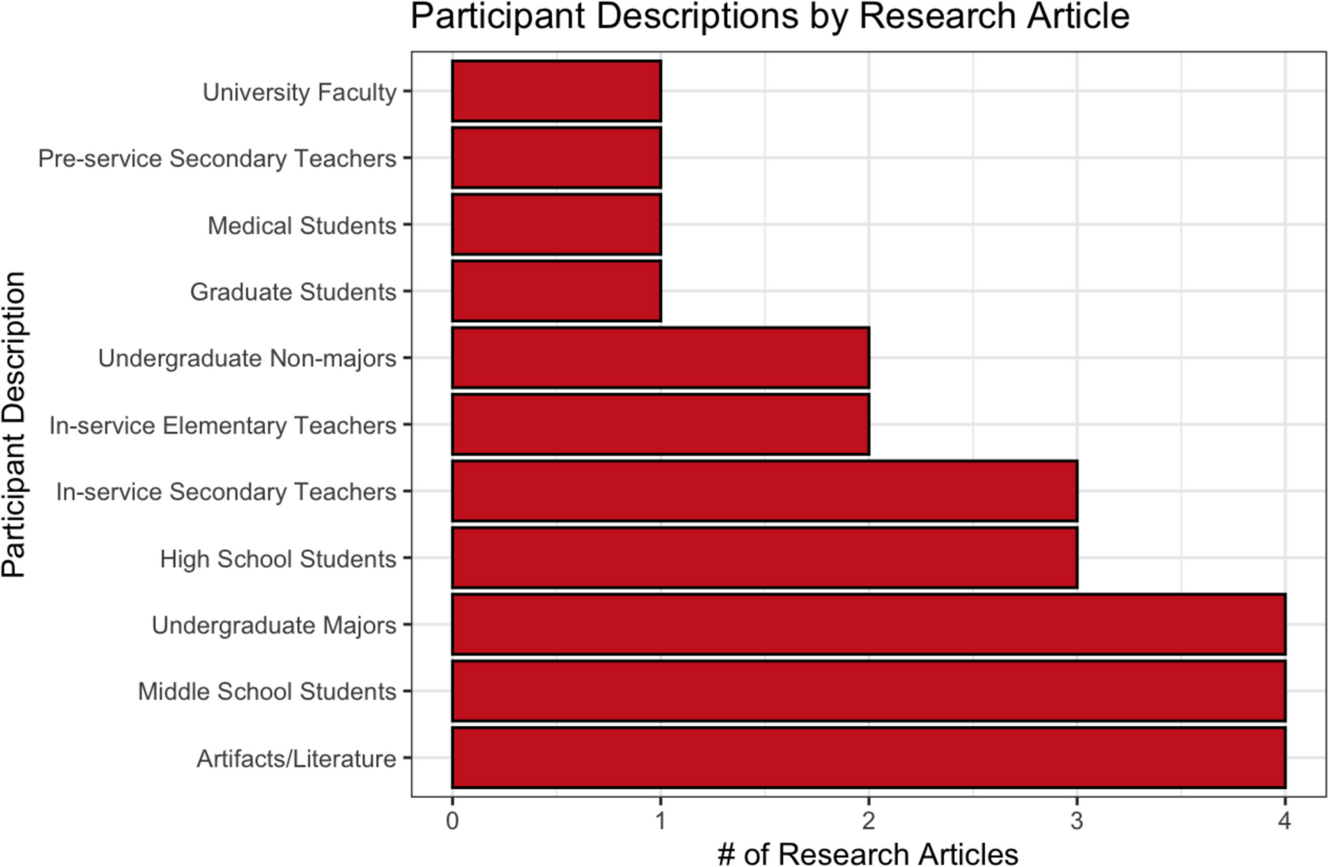 The disciplinary field was collected to ensure each study was based on science education and to compare which sub-disciplines of science education are using ENA (i.e., biology, chemistry, physics). We also extracted which conceptual and/or theoretical framing was used by each study. Finally, we extracted data about the participant samples used in each study including a description of the sample (i.e., K-12 students, undergraduates, teachers) and the sample size.