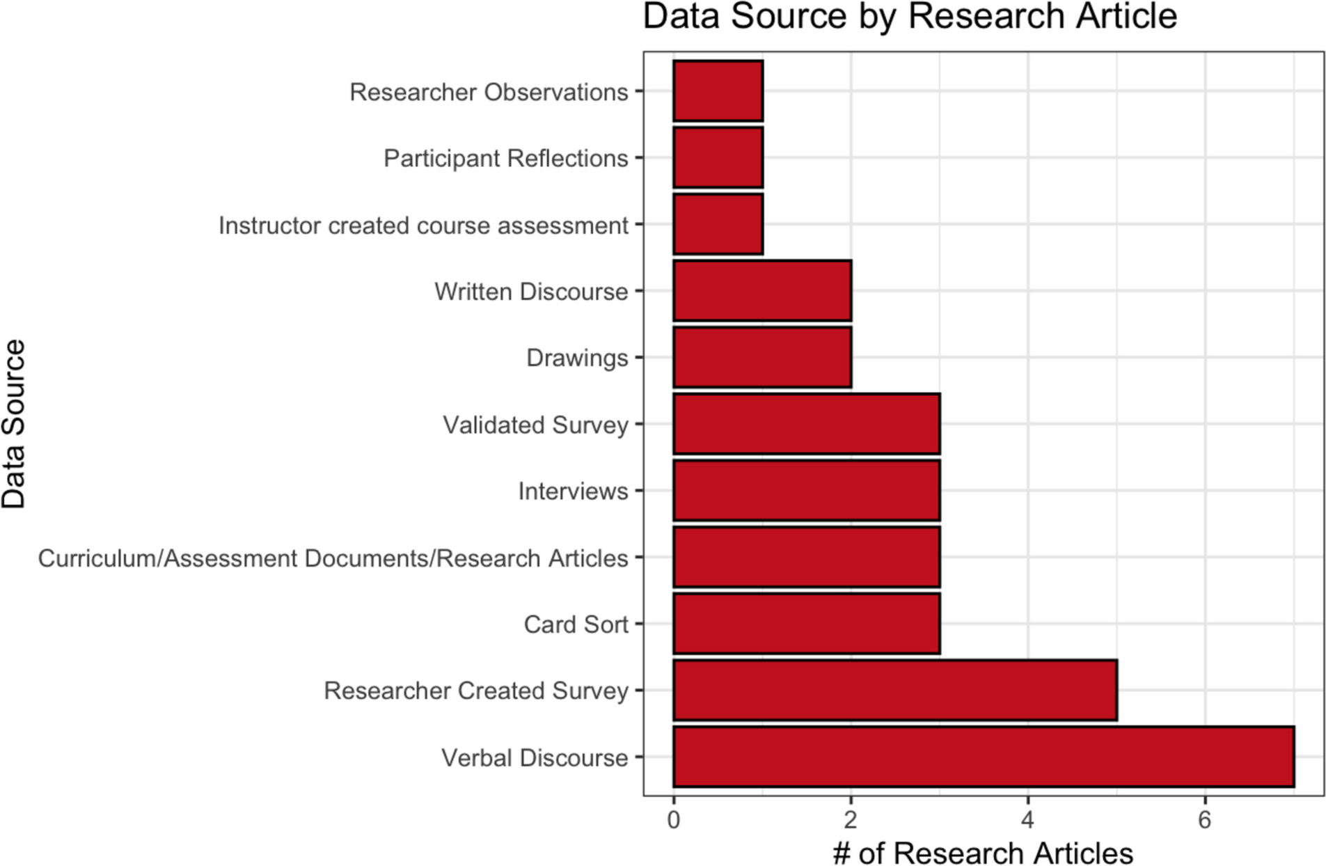We extracted data on the number and context of the research questions that were asked to deduce whether each study was causal, mechanistic, or descriptive in nature. Causal studies ask whether one variable leads to another variable (i.e., does X lead to Y?) and examine the relationships between variables whereas, mechanistic studies often ask how or why one variable leads to another, further examining causal relationships (National Research Council [NRC], 2002). Descriptive studies are exploratory in nature, typically not hypothesis-driven, and often ask “What is happening?” (NRC, 2002). We then extracted the overall research methodology (quantitative, qualitative, or mixed-methods) and research design (random sample, quasi-experimental, descriptive/interviews). Finally, we extracted the data collection level (individual, small groups, large groups/whole class) and how this data was collected (card sorts, drawings, verbal/audio recordings, etc.).