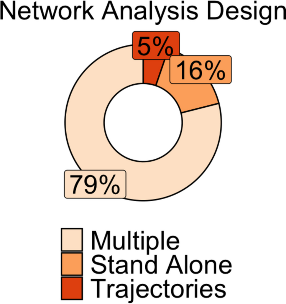 Relative frequency of network analysis design. N = 19. Multiple refers to the study reporting multiple network models (i.e., multiple individual models). Stand-alone refers to studies that reported only a single network model. Trajectories refer to studies that reported multiple networks but specifically compared changes across time (i.e., pre-post design)