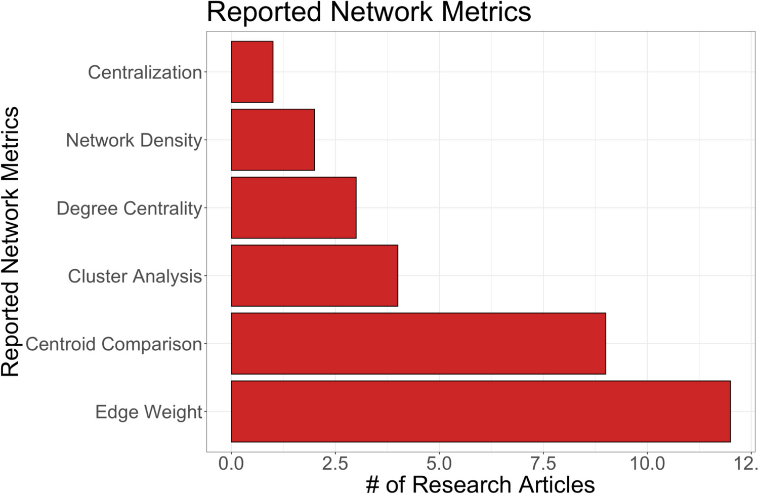 We found that the most utilized network metrics were centroids (n = 9 [47.4%]) and edge weight (n = 12 [63.2%]) (Fig. 9). Due to variation in how these metrics were reported, some studies qualitatively compared edge weight and connections. Cluster analysis was utilized by three studies to identify subgroups within a network. For instance, Peters-Burton et al. (2023) used cluster analysis within the overall network models to identify how NOS constructs were grouped together within students’ epistemic frames. Finally, only five of the studies used more traditional network measures, such as centrality measures and density.