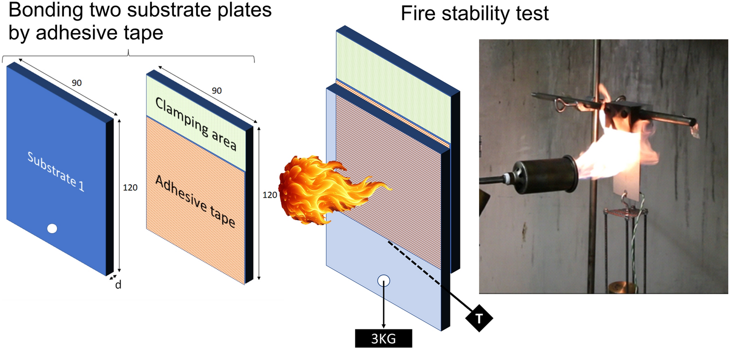 The fire stability was measured in a small-scale test which was developed to determine the stability of the adhesive bond against a flame, simulating a fully developed fire. Thus the necessity of the time-consuming, expensive, large-scale tests that are normally performed [26] to measure the fire stability was eliminated [27]. This test is designed to generate a ranking of the effects of different flame retardants on the fire stability of the adhesive joint. Therefore, two substrates of the same material were bonded together by the tapes and a weight of 3 kg was mounted to the lower half of the substrate as shown in Fig. 1. The substrate thickness was 4 mm for wood and 1 mm for zinc plated steel. The two substrates were chosen due to their different behavior during fire exposure. Steel as an incombustible material is expected to stay unharmed during the test whereas wood is suspected to be ignited and deform during the test. Thus, for steel, only the thermal stability of the adhesive joint is relevant for the failure. For wood in contrast, the interaction between deforming, decomposing wood and the adhesive gap plays a role. The loaded sample was fixed in a clamp in a stand and exposed to a defined burner flame. The heat flux and temperature of the flame was calibrated for a certain distance between burner and the specimen surface and was kept the same for all measurements. The calibration was performed with a heat flux meter which was installed in the recess of a calcium silicate plate with a direct exposure to the burner flame. An irradiance of 75 kW m−2, as a full developed fire heat flux [28], was chosen as the irradiance level at the specimen surface. The distance was fixed at 12.5 cm and the gas flow of the burner (propane) was kept constant at 3 L min−1. The time to failure of the adhesive bond and the temperature of the back surface of the substrate plate that is exposed to the burner flame was measured to obtain information about how the single components of the adhesive tape and the substrates influence the adhesive’s stability in a fully developed fire. The back temperature of the first layer represents the temperature impact that the adhesive is exposed to.