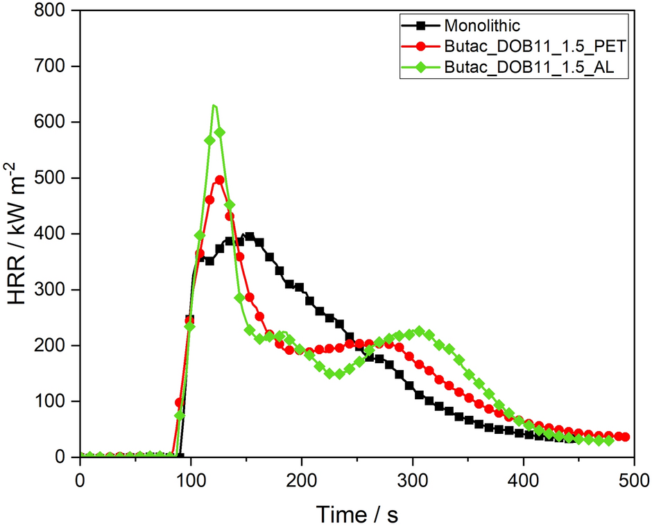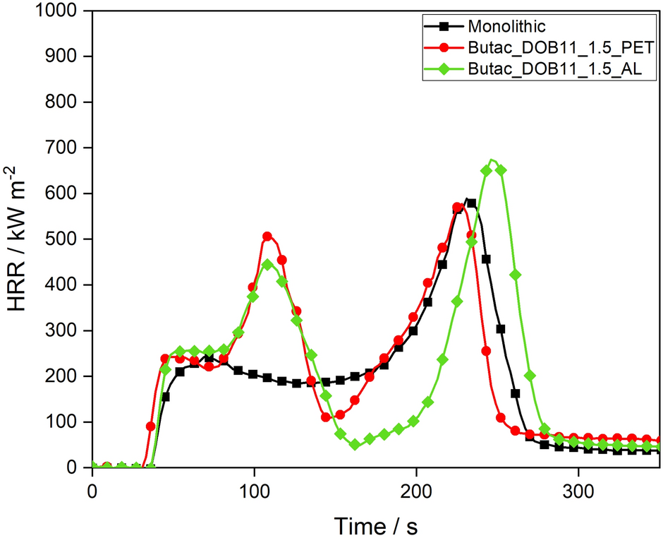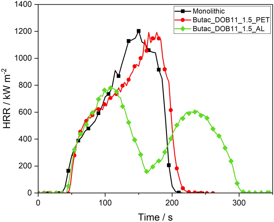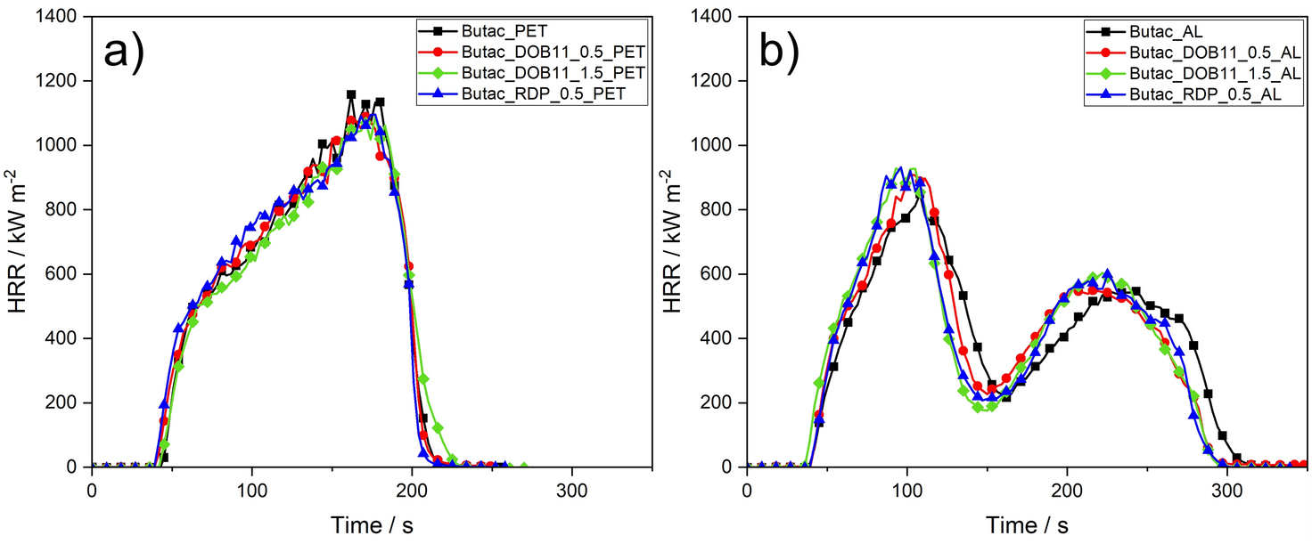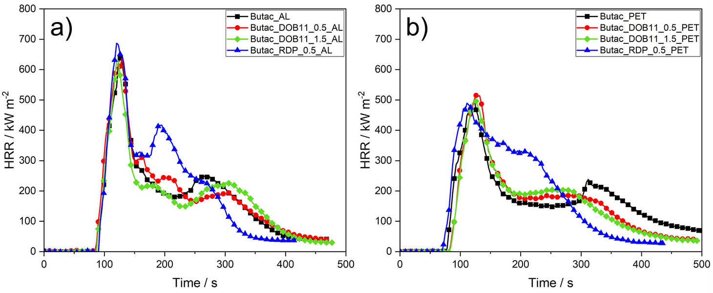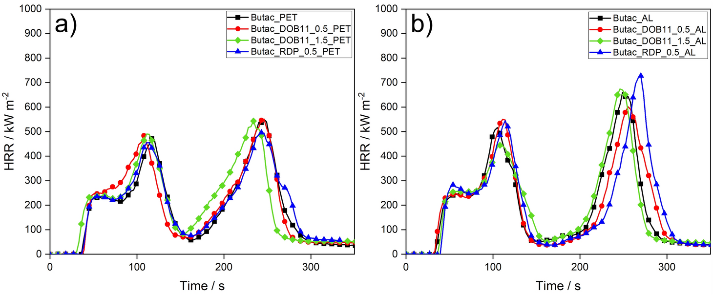 The performed cone calorimeter investigations are not only academic investigations but serve as release relevant tests for the interior of railway vehicles (EN 45545, 2020). Also, the UL 94 tests are applied in industry as release relevant test for electric applications.