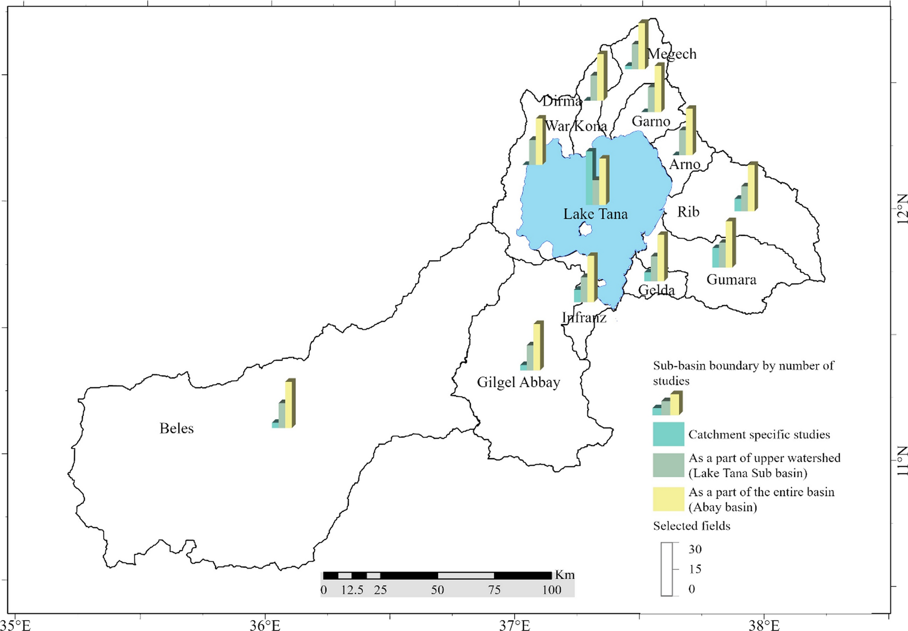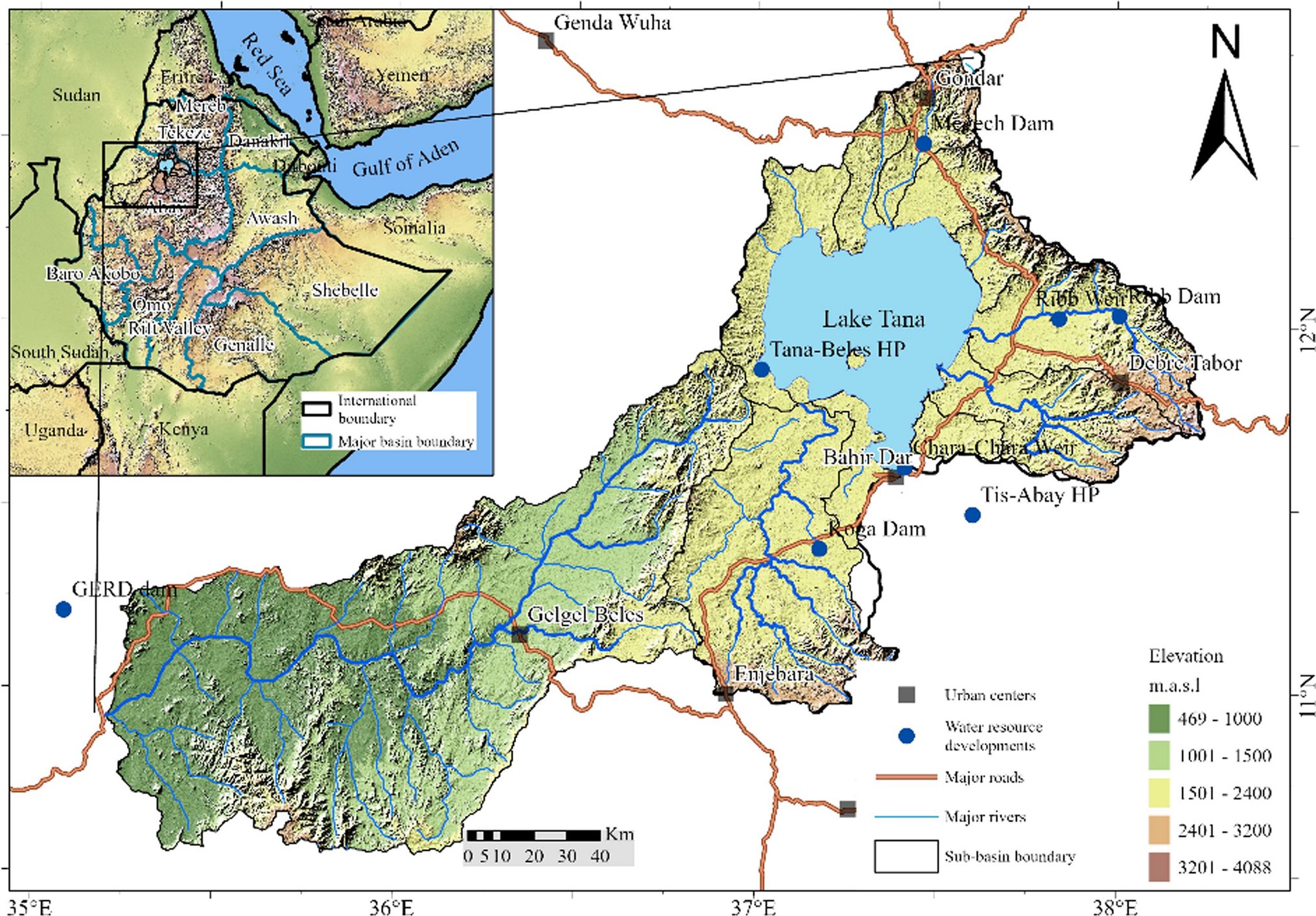 Tana-Beles sub-basin is one of the largest sub-basins of the Blue Nile and covers an area of 29,200 km2. The Sub-basin extends between 10.5° N and 12.78° N latitude and from 35.1°E to 38.2°E longitude. It comprises two topographically disconnected sub-basins: Lake Tana and Beles, both draining towards the Abay River (Blue Nile) (Fig. 1). Lake Tana sub-basin features a significant elevation range, from 1785 to 4100 m a.s.l receiving an annual precipitation of 1280 mm and maintaining an average temperature of 22 °C (Abebe et al. 2017; Goshu and Aynalem 2017). In contrast, the Beles sub-basin exhibits a warmer and sub-humid climate with average temperatures increasing southward, reaching more than 30 °C at the southernmost tip. Rainfall in Beles varies between 900 and 1400 mm annually (Weldegerima et al. 2023). This diversity in climate defines the unique landscapes and ecosystems across the Tana-Beles Sub-basin.