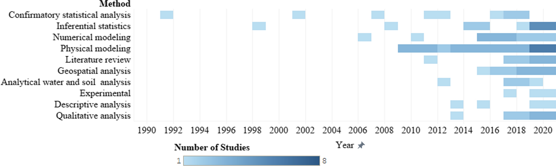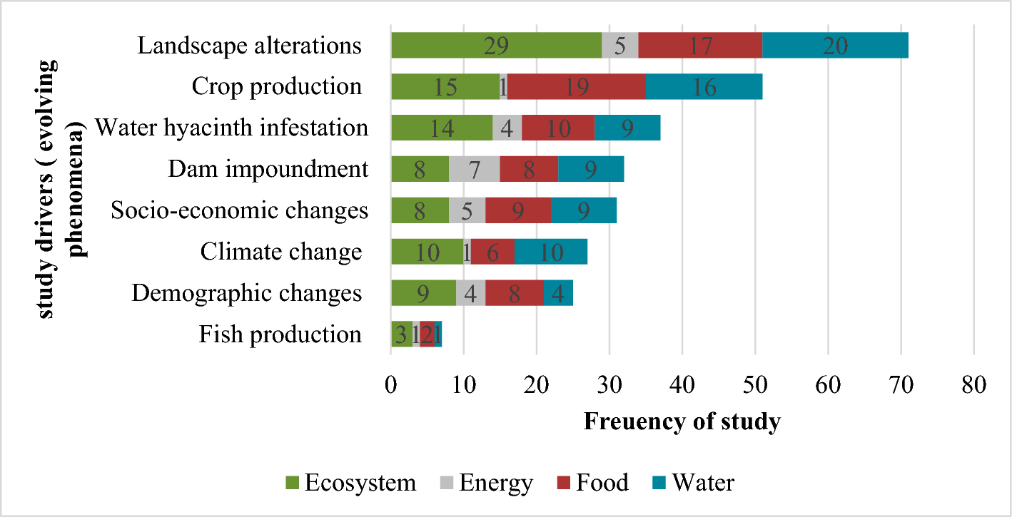 The drivers represent recent or ongoing changes, both anthropogenic (human-induced) and natural, that are hypothesized to influence WEFE within the region. We employed a content analysis approach to identify these drivers manually from the objectives and result parts of the selected studies. Then, we analyzed the co-occurrence of these drivers with specific WEFE components. This involved counting studies mentioning drivers, diagnosing their influence on WEFE components, identifying critical nexus interactions, linking drivers across multiple components, and assessing their causal effects on the entire nexus.