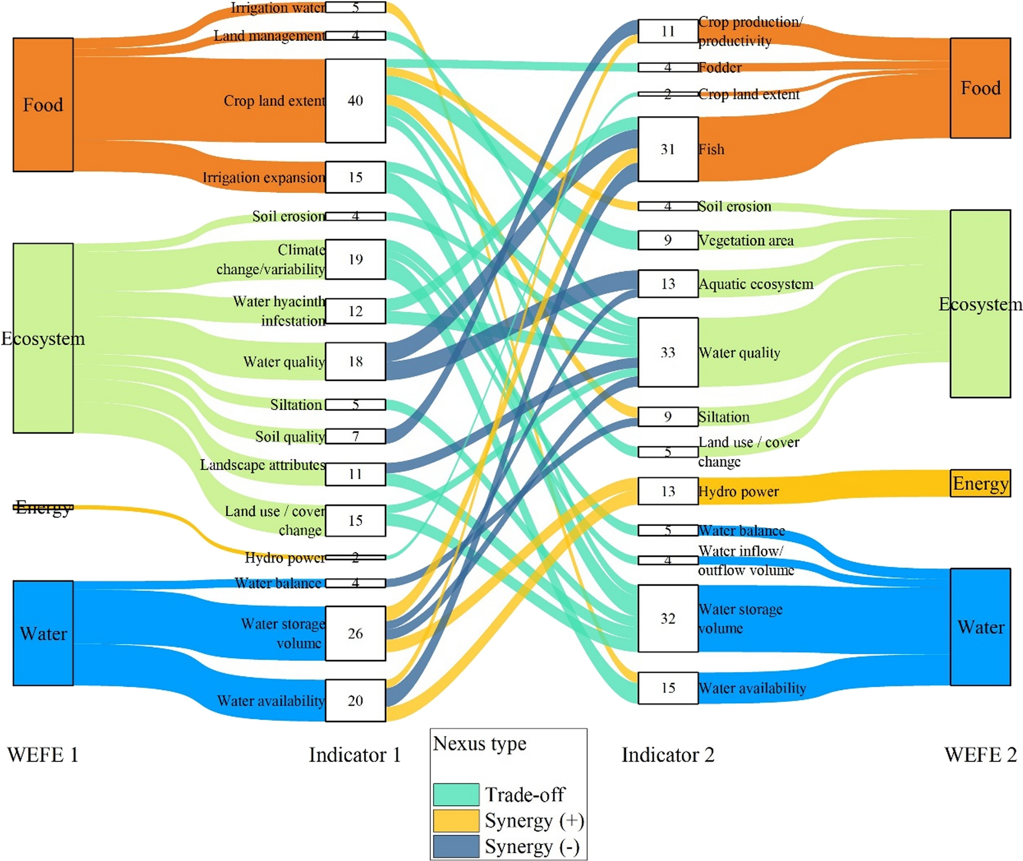 These interactions were drawn and visualized using a chord diagram and Sankey diagram, showing co-occurrence frequency alongside nexus type. Chord and Sankey diagram are useful to illustrate the interconnections between indicators across multiple components of a system. Higher frequencies suggest established relationships, while lower ones highlight areas needing further research.
