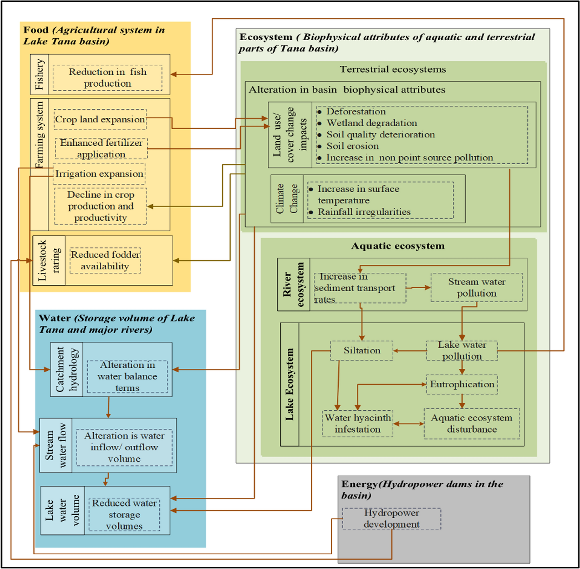 The Tana-Beles Sub-basin exemplifies the challenges of managing natural resources with multiple stakeholders and sectoral interests. Identified as a growth area due to its potential for irrigation, hydropower, high-value agriculture, and ecotourism, the sub-basin faces significant development pressures. Large-scale projects like the Koga (7,000 ha) (Eriksson 2012), Ribb (19,925 ha) (Eriksson 2012), and Megech (7314 ha) (MEE 2010) irrigation dams alongside Tana-Beles inter-basin water transfer hydropower dam (485 MW) (Annys et al. 2019) exemplifies this. Studies report that these projects are inducing widespread wetland loss, deforestation, biodiversity decline, declining soil fertility, erosion, sedimentation, water pollution, and aquatic ecosystem degradation (Eguavoen and Tesfai 2012; Mequanent et al. 2021; Tewabe 2020). Furthermore, overpopulation, land degradation, and urbanization exacerbate these issues (Admas et al. 2022; Dile et al. 2018; Karlberg et al. 2015). The intricate relationships between these challenges necessitate a nexus approach, considering the interconnectedness of water, food, ecosysetm and energy security. A nexus approach can potentially optimize resource use, mitigate environmental impacts, and achieve sustainable development in the sub-basin. Existing research on hydrology, landscape dynamics, and water ecology within the sub-basin provides a valuable foundation for identifying key nexus interactions and formulating solutions.