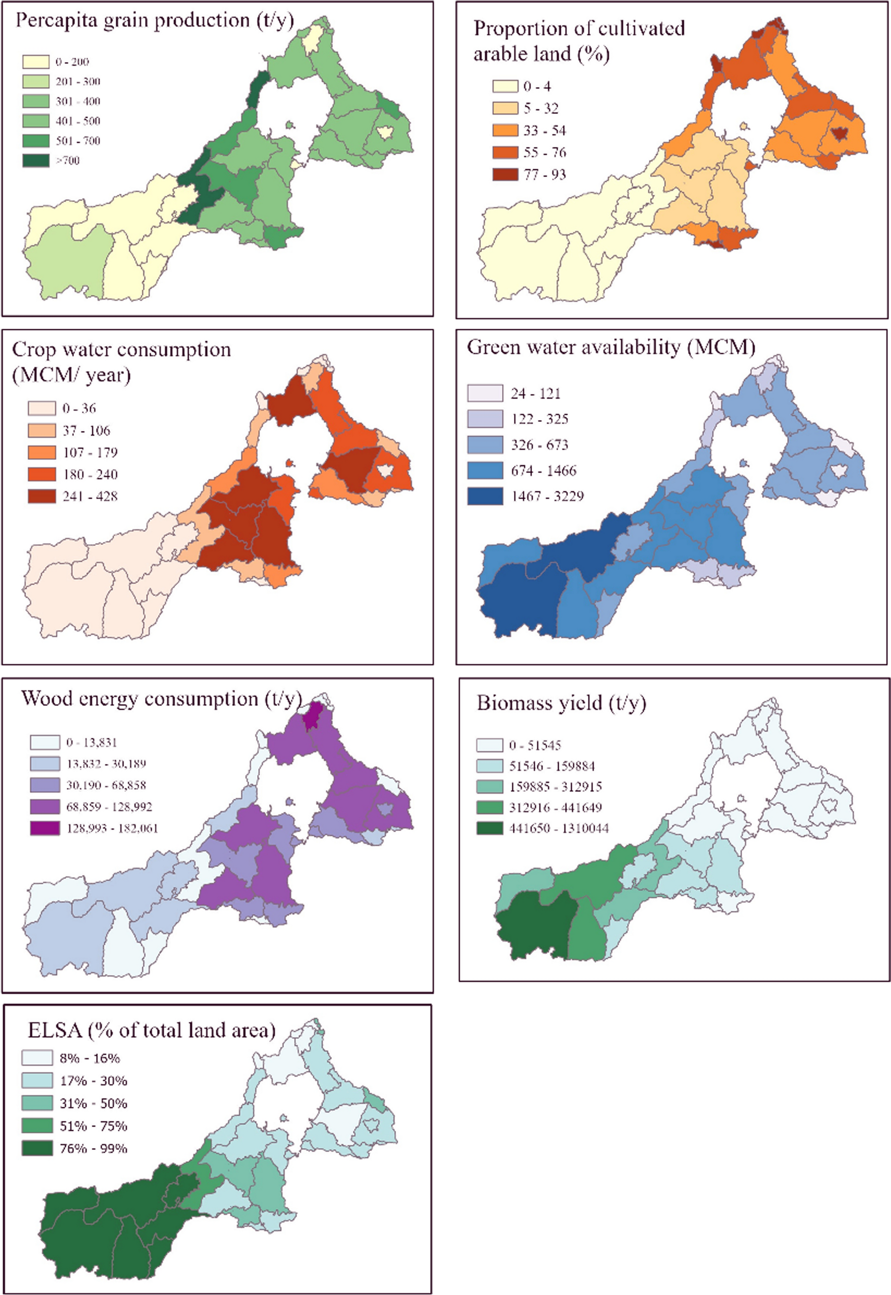 For the ecosystem subsystem, two indicators were used to measure its status: biomass yield and essential life-supporting areas (ELSA). The biomass yield of the sub-basin was calculated based on the biomass yield estimates for different agroecological regions in Ethiopia provided by WBISP (2004), specifically for shrubland and forest biomes as they constitute the main sources of fuel wood in the study area (Woldeamlak Bewket 2005). Then, the total biomass yield of each woreda was estimated by multiplying the coefficient values by the area coverage of shrublands and forests. This gives the mean annual biomass yield of the study woreda in tons.