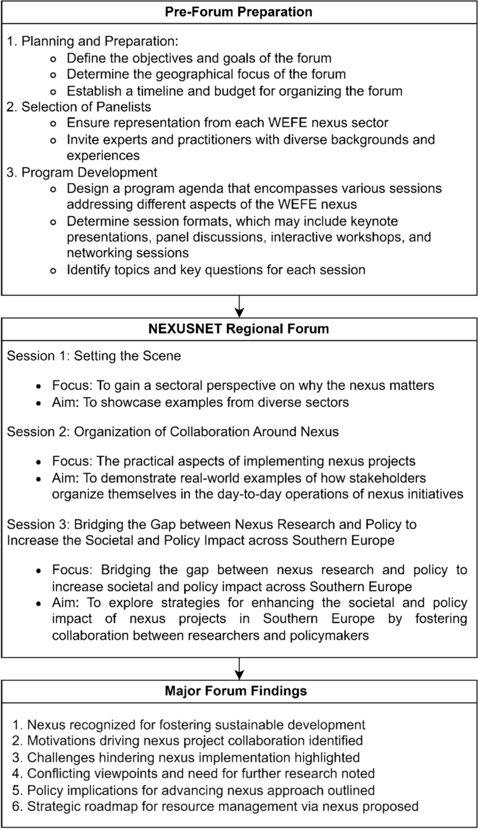 The interactions between the WEFE nexus sectors have captured the interest of both academia and policymakers due to the significant impacts that sectoral policies can have on other sectors, leading to challenges in effectively implementing sustainability initiatives related to the WEFE. The focus has been on understanding these interconnections and developing strategies to minimize unintended consequences while maximizing co-benefits. This has been a driving force behind research and policy discussions in Europe and beyond for the past decade. The increasing number of events in Europe addressing the nexus reflects a heightened emphasis on discussions among researchers, funding agencies, and practitioners. The 1st NEXUSNET Regional Forum of stakeholders, organized in Split, Croatia on September 28, 2023, particularly highlights stakeholders-practitioners, those influencing and being influenced by the WEFE nexus. NEXUSNET is an international network of researchers working with universities, research institutions, policymakers, and the business sector to better understand how the water-energy-food nexus promotes policy coherence and biophysical interactions in the domains of water, energy, and food, thereby supporting Europe’s transition to a circular and low-carbon economy. The forum serves as a pivotal component within the NEXUSNET framework and the overarching WEFE nexus research and policy agenda. It provides a platform for practitioners, policymakers, and researchers to convene and discuss the challenges and opportunities surrounding the implementation of WEFE nexus approaches. By focusing on practical implementation and mutual learning between stakeholders, the forum directly contributes to bridging the gap between nexus research and its real-world application. The overall process of the NEXUSNET Regional Forum, from pre-forum preparation to the presentation of major findings, is illustrated in Fig. 1. The objective of this paper is to disseminate the findings and suggestions derived from the forum to benefit nexus practitioners and policy-makers. Thus, this paper presents the findings derived from the minutes of the Forum, offering a comprehensive overview of the outcomes from each session. The structure of the article is organized as follows: methodology, session analyses and outcomes, and concluding remarks. The results from individual sessions are detailed in their respective sections, providing a thorough exploration of the insights and discussions that transpired during the event.
