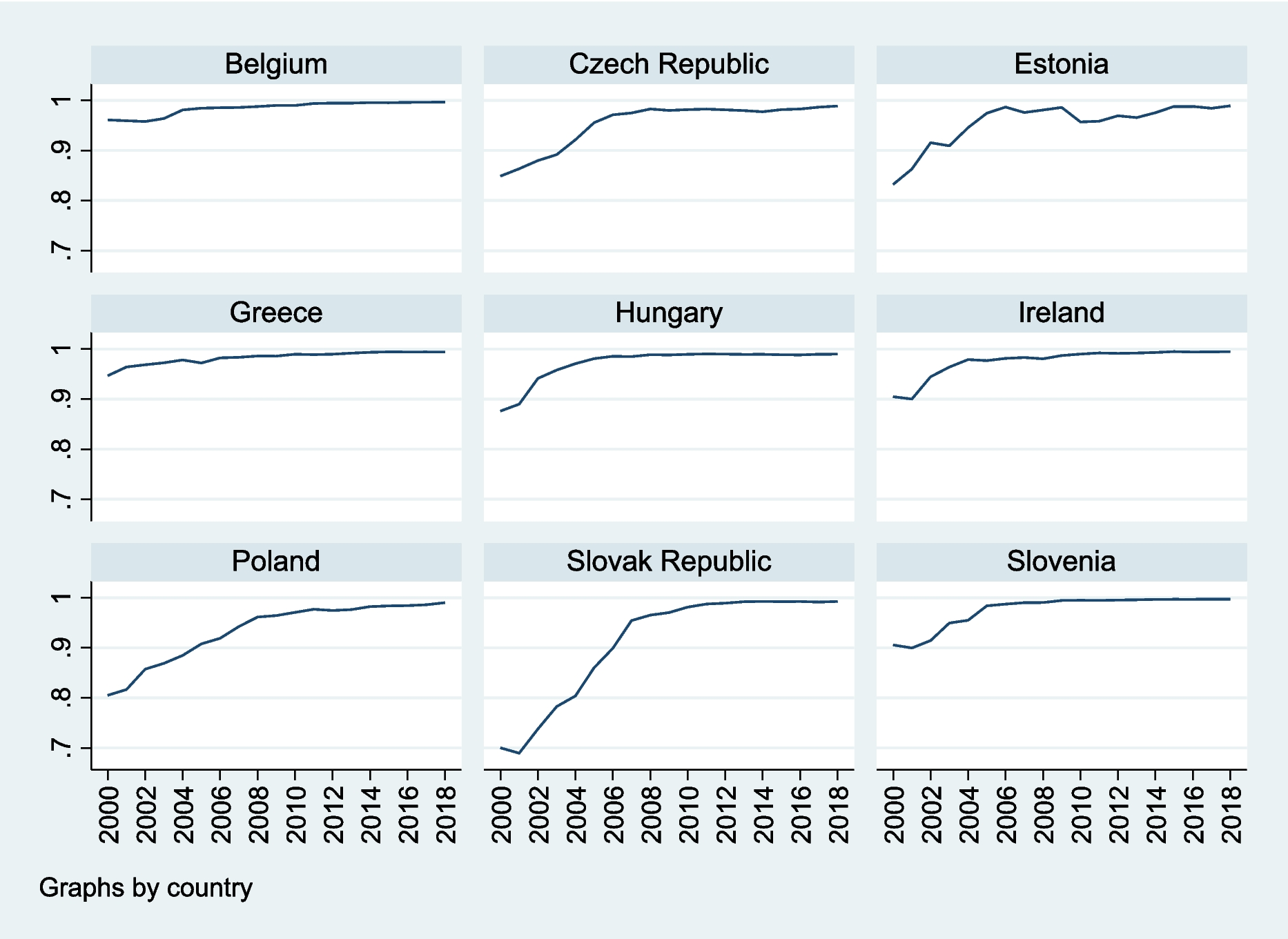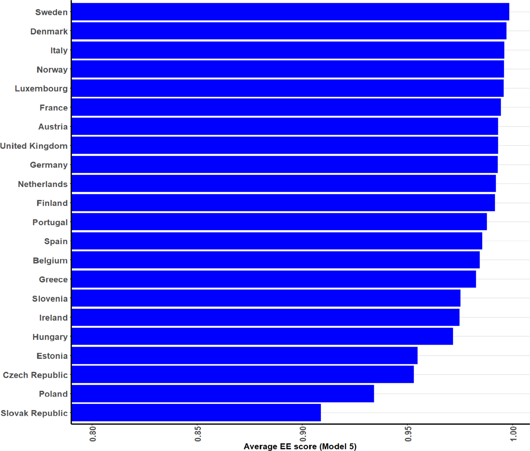 The results reveal notable variation in EE across countries. Average EE scores over the 2000–2018 period range from 0.91 to 0.99 across the 22 countries analysed. Sweden, Denmark, Italy, Norway, and Luxembourg consistently emerge as the most eco-efficient, while the Slovak Republic, Poland, and the Czech Republic are among the least eco-efficient. Luxembourg’s strong performance likely reflects its service-oriented economic structure, which inherently generates lower emissions; however, this factor is explicitly controlled for in the model through country fixed effects and energy mix variables.