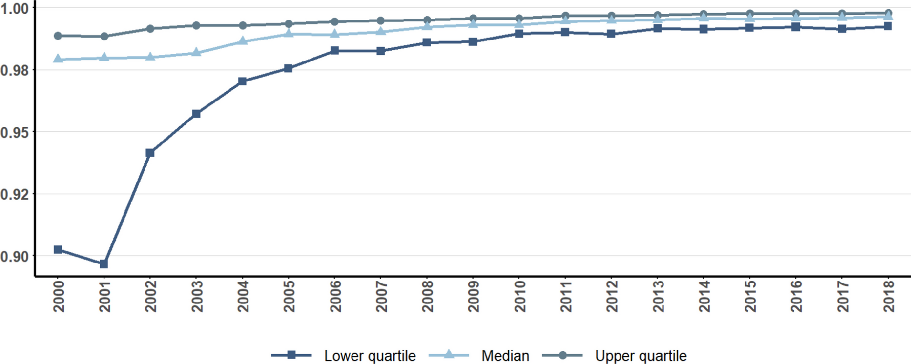 Figure 2 illustrates the evolution of EE scores over the period 2000–2018, displaying the first and third quartiles along with the median annual scores from Model 5 for all sample countries. The figure shows that the gap between the quartiles has progressively narrowed, suggesting a trend towards convergence in EE. Countries that were previously less efficient have made notable improvements, gradually approaching the performance level of the more efficient economies. This pattern indicates a collective advancement in EE across the sample over time.