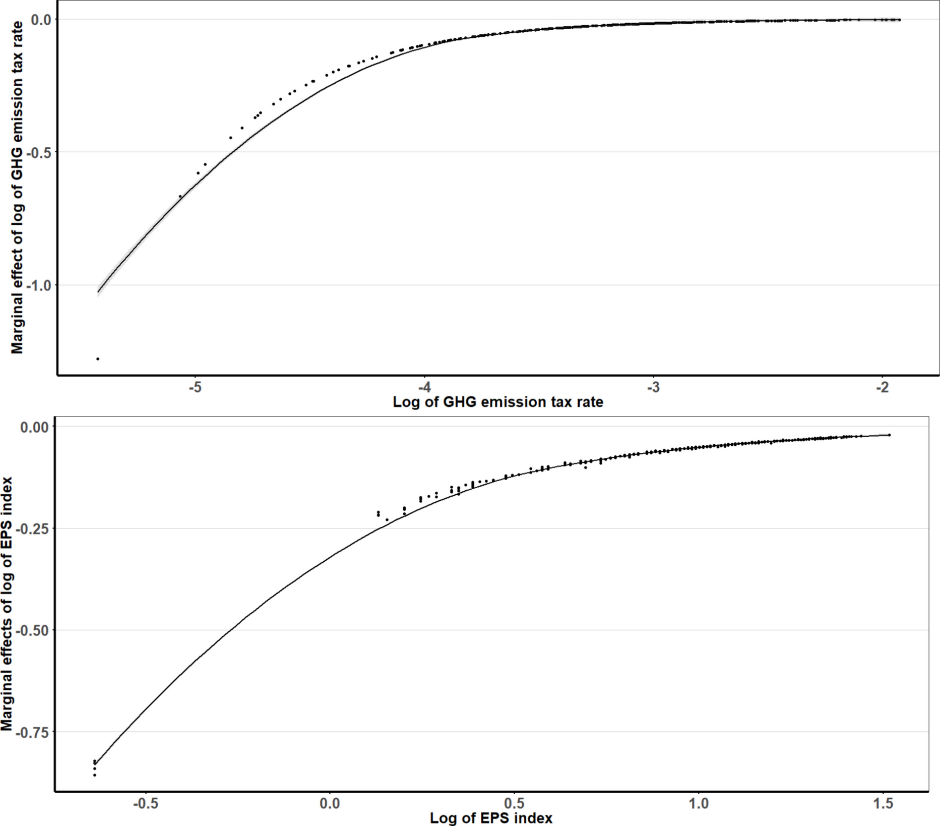 The findings presented in Table 2 show that EPS index and GHG emission tax rate have statistically significant effects in explaining EE gaps across countries. To further explore these relationships, we assess whether the marginal effects of these variables vary with their magnitude.12 Figure 3 illustrates that increases in both the GHG emissions tax rate and the EPS index initially lead to reductions in EE gaps. However, the efficiency gains diminish at higher levels of these variables, suggesting diminishing marginal returns to policy stringency and taxation.