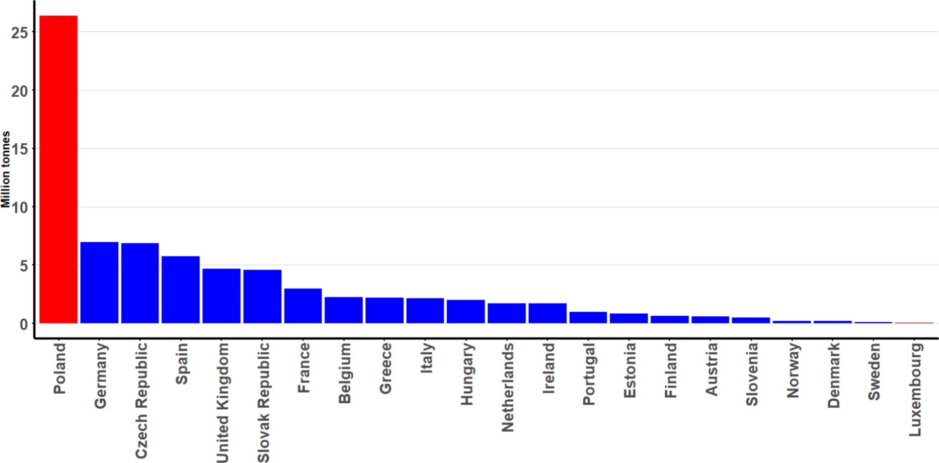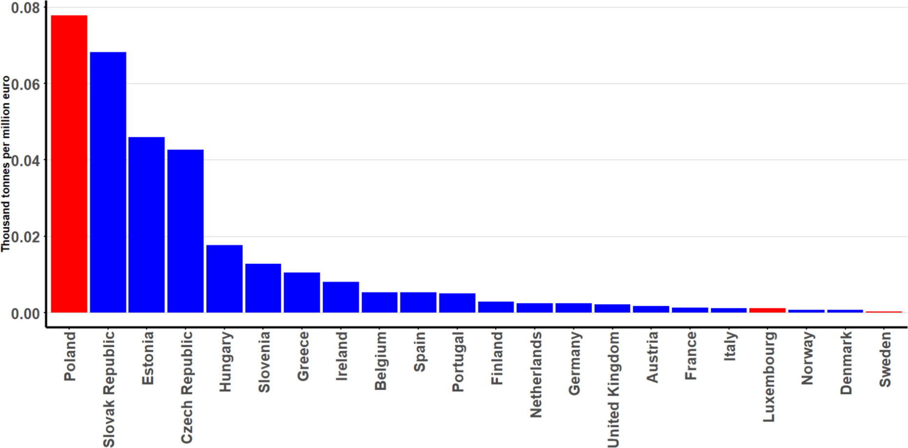 The data in Fig. 4 rank countries by their potential for carbon savings, from highest to lowest. Poland exhibits the greatest potential for yearly carbon savings per million euro of GDP, at approximately 0.08 thousand tonnes (i.e. 80 tonnes). It is followed by the Slovak Republic, Estonia, and the Czech Republic. In contrast, countries such as Sweden, Denmark, Norway, Luxembourg, and Italy display minimal potential for CO2-equivalent carbon savings. For Luxembourg in particular, the figure shows a very small potential saving—well below 0.01 thousand tonnes per million euro—which aligns with its service-oriented and already low-carbon economy.