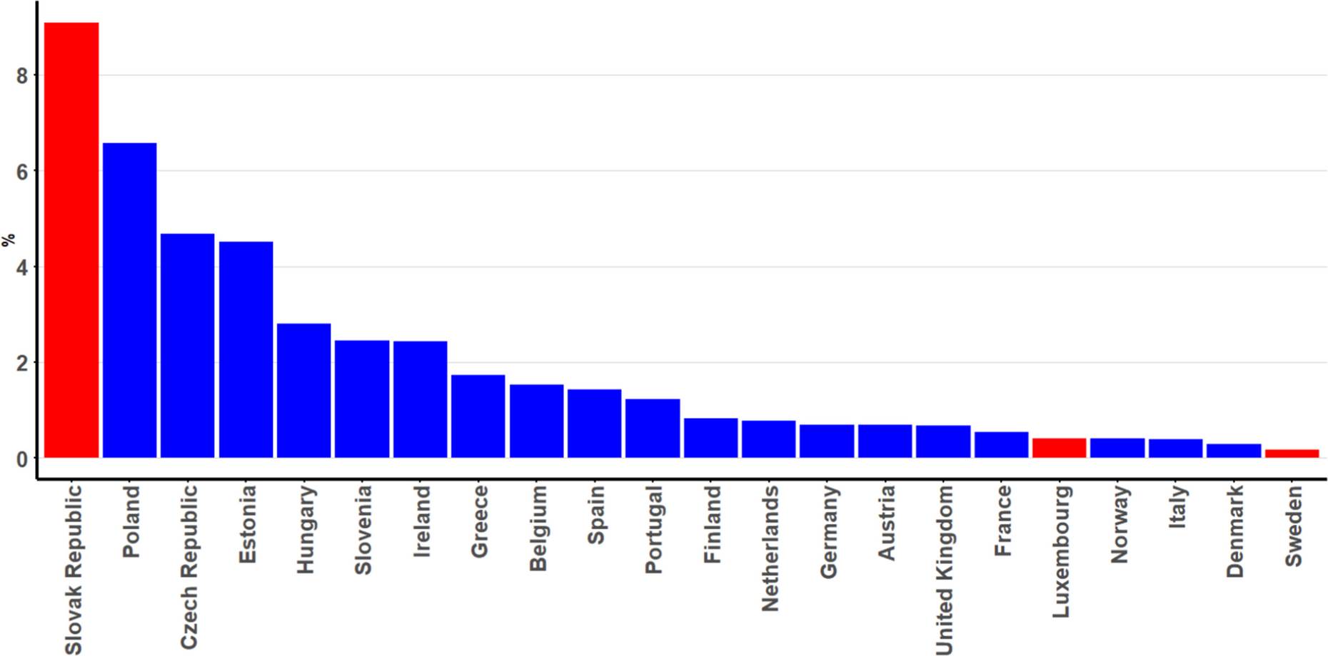 Finally, Fig. 6 presents the potential savings as a share of each country’s total emissions, assuming complete elimination of EE gaps. The Slovak Republic ranks highest in percentage terms of average annual emissions saved, followed by Poland and the Czech Republic. In contrast, Sweden, Denmark, Italy, Norway, and Luxembourg exhibit the lowest potential for savings relative to their average annual emissions. For Luxembourg, the estimated saving accounts for only a fraction of one percent of its current annual emissions—among the smallest in the sample. This limited potential reflects the country’s service-based economic structure and the fact that many EE gains have already been realised.